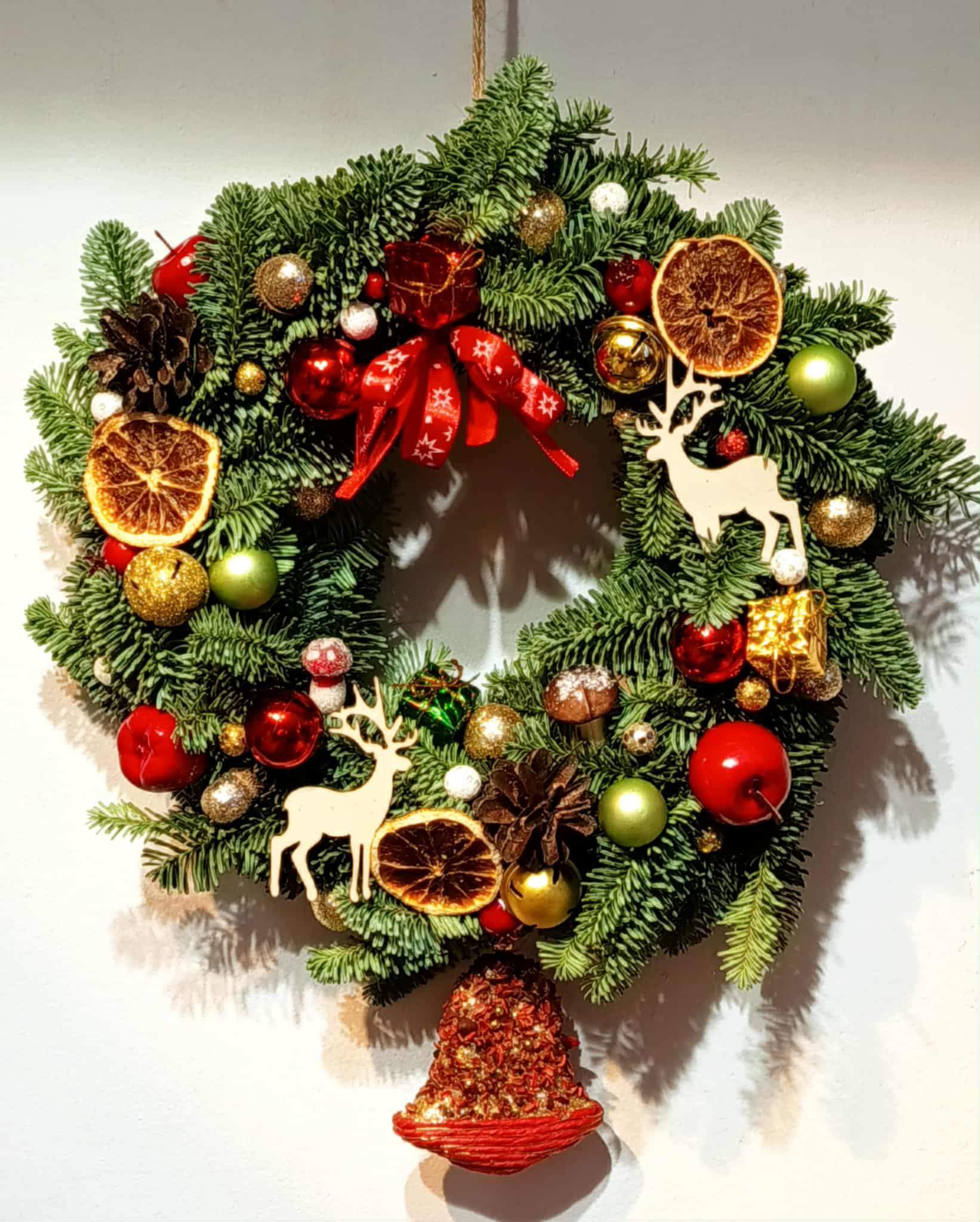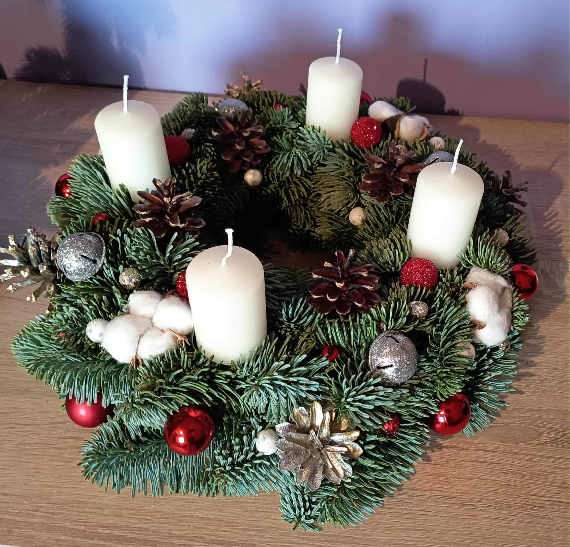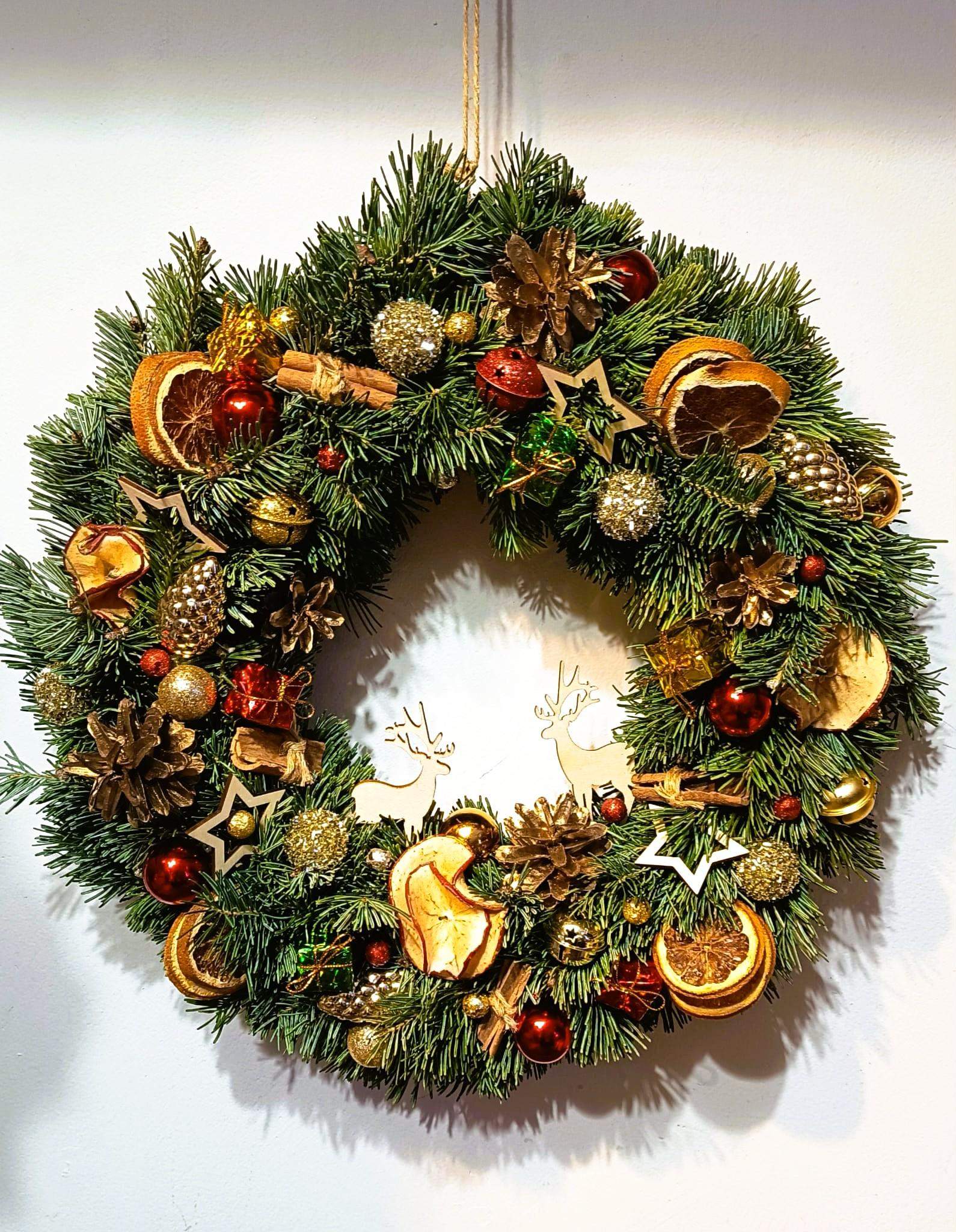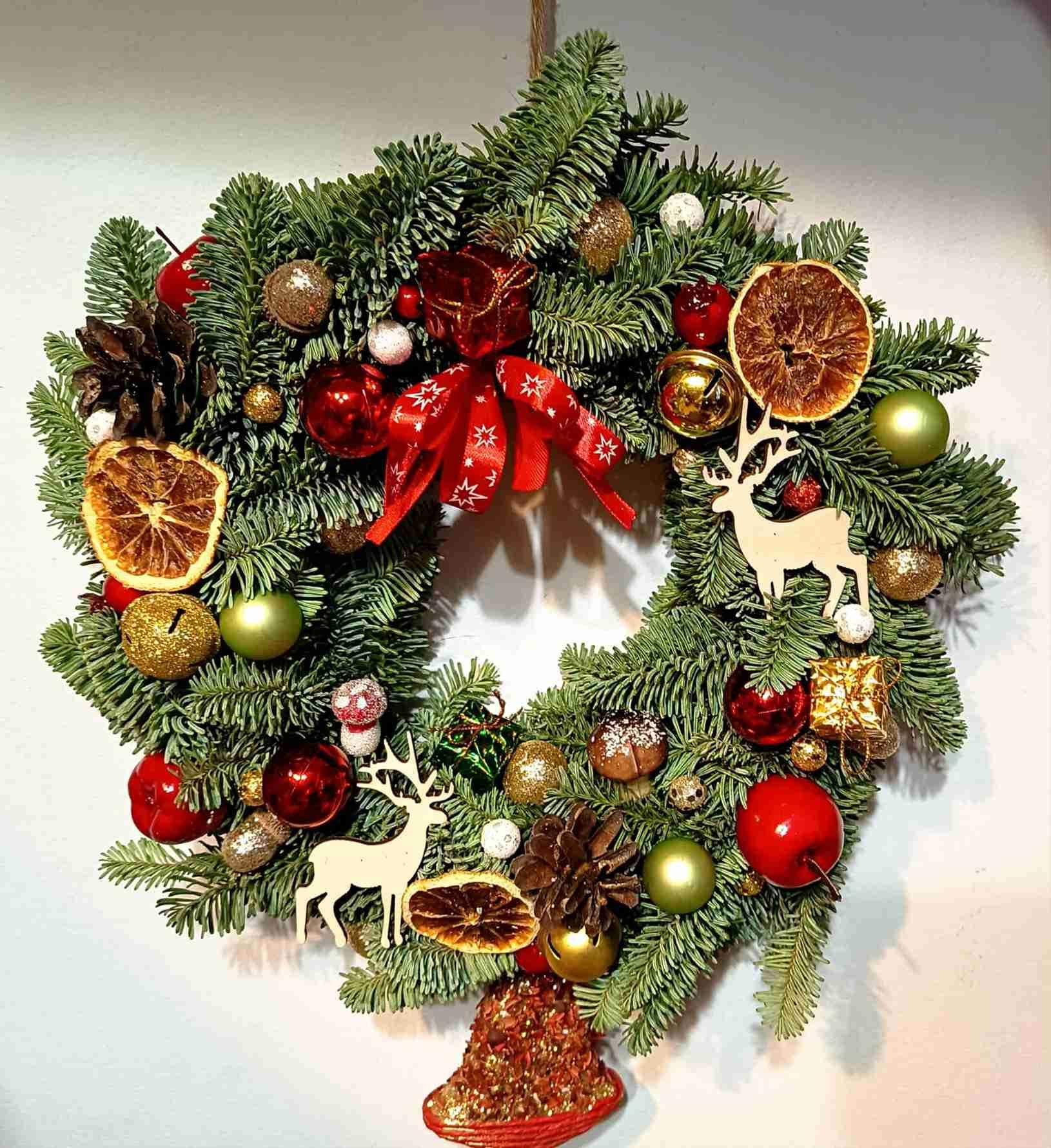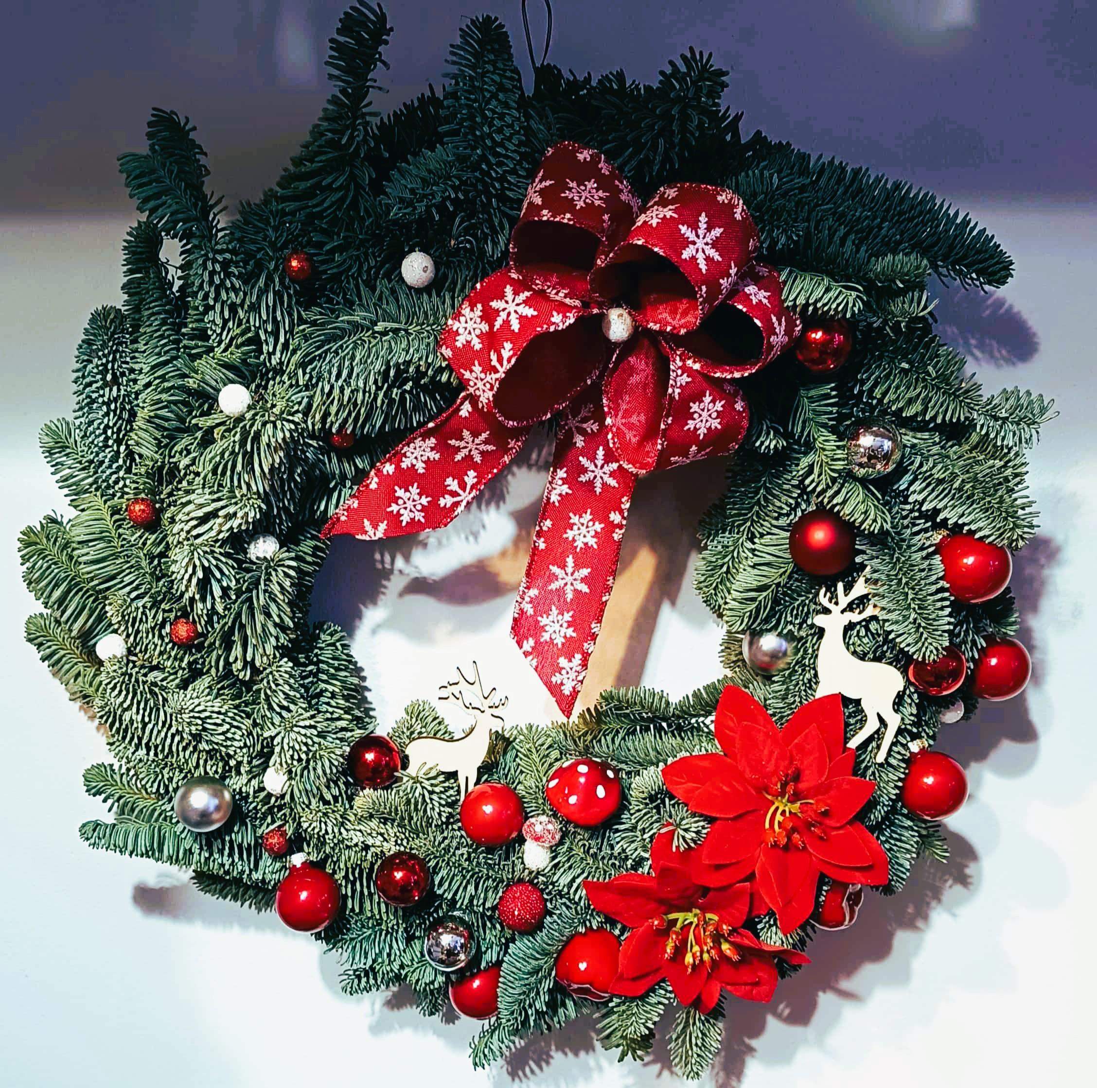 Jodła nobilis lub kaukaska. Wielkość wianków pomiędzy 30-40 cm. Kolorystykę ustalamy indywidualnie. Poniżej aktualnie dostępne od ręki.