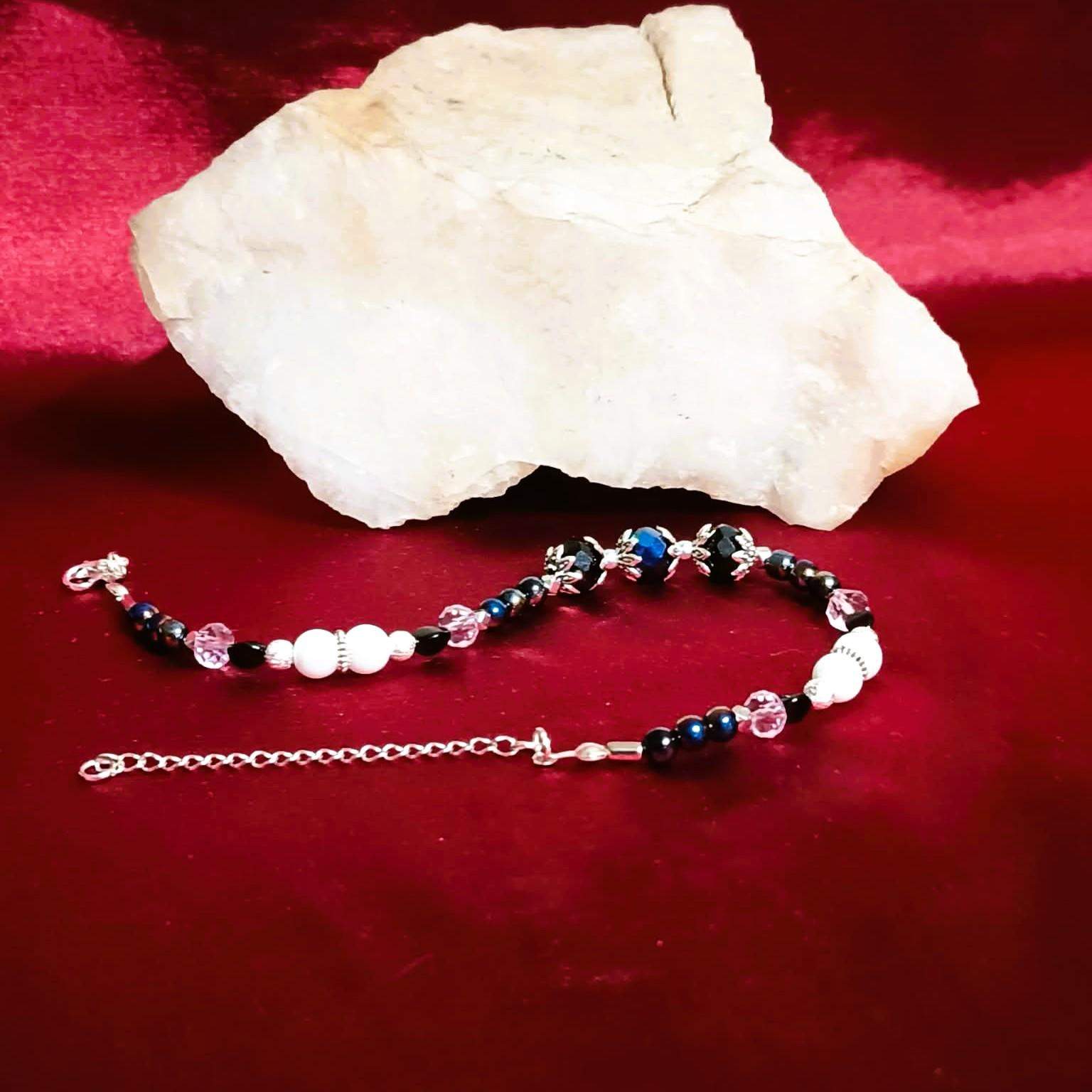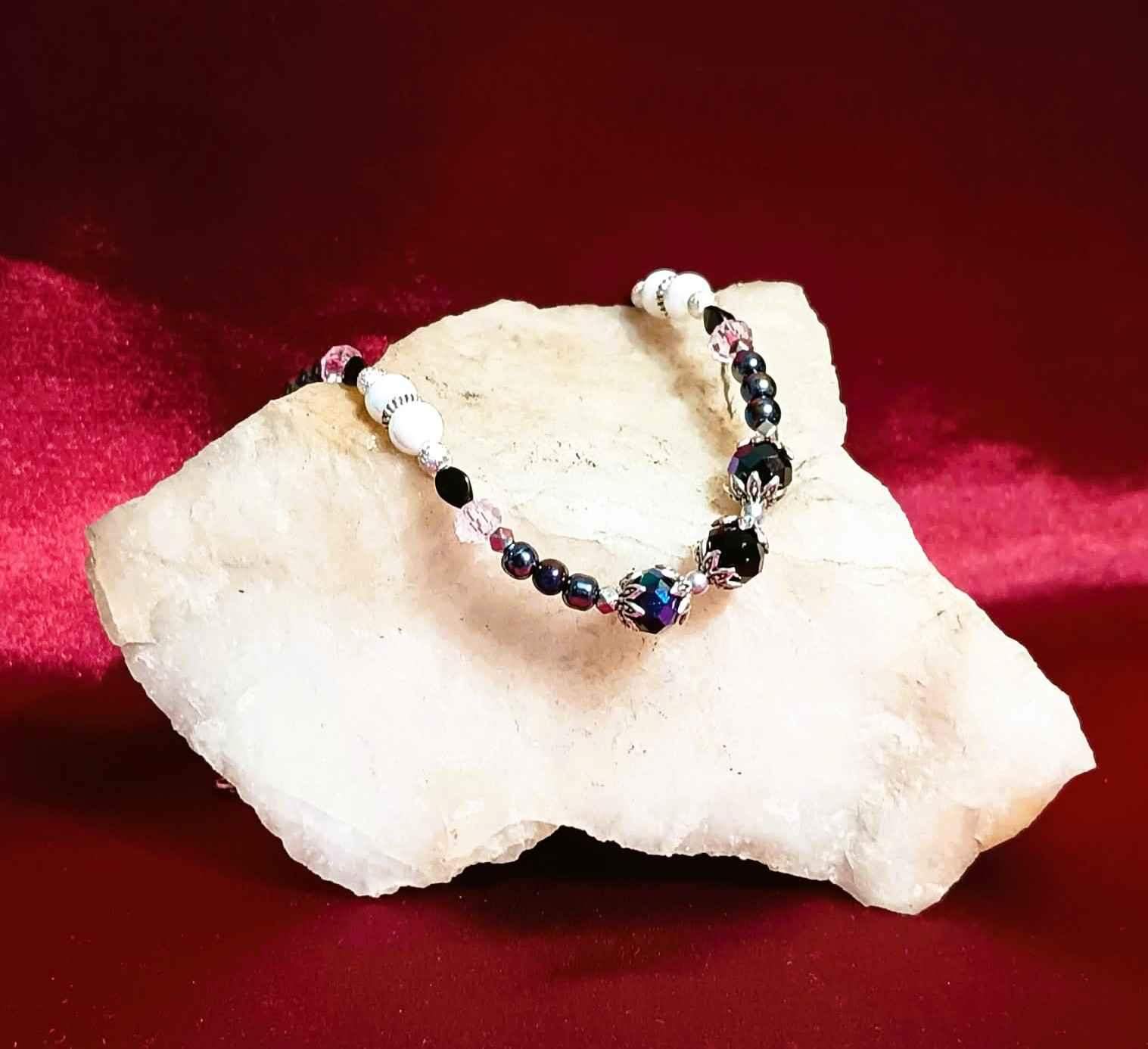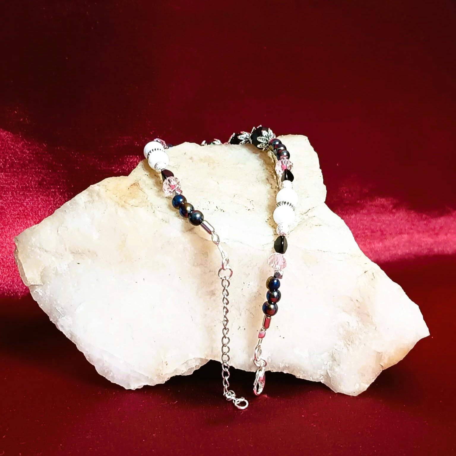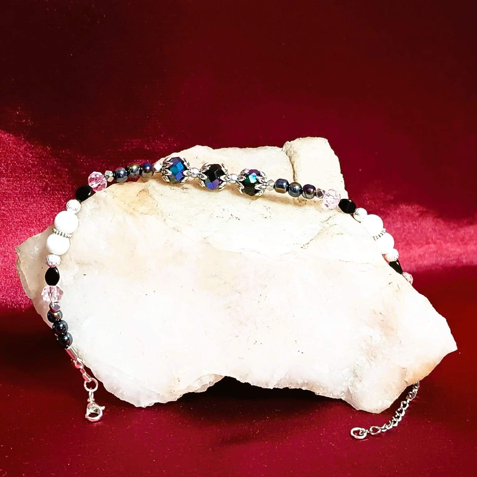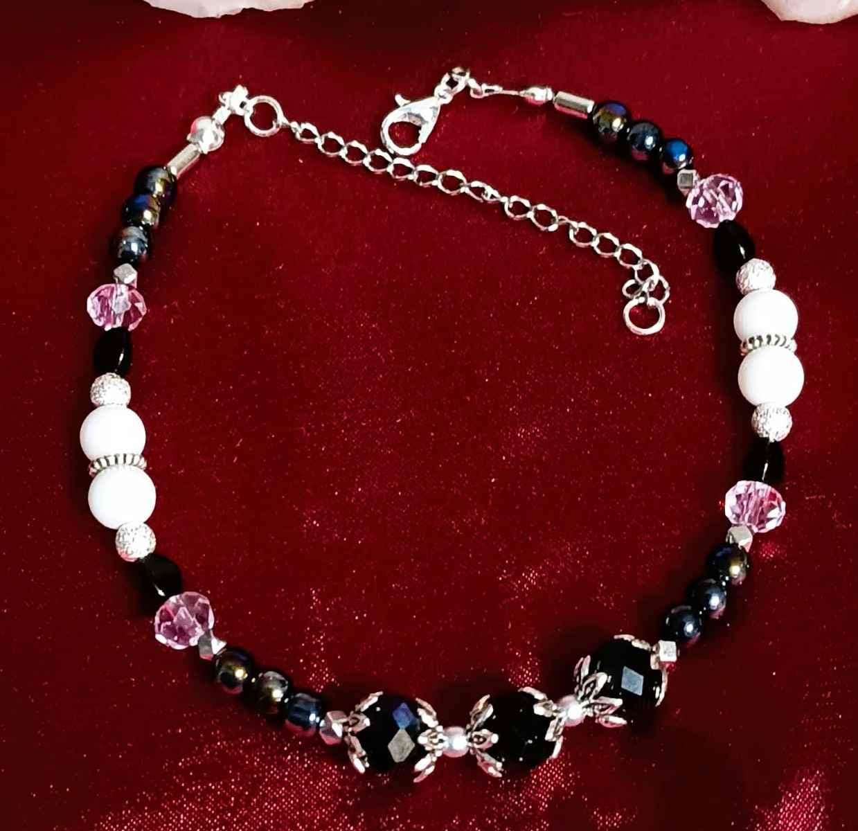 Model został wykonany z kilku różnych rodzajów gładkich, połyskujących perełek, różowych pastelowych kryształków oraz czarnych kryształów osadzonych w ozdobnych, srebrzystych przekładkach umieszczonych w centralnym miejscu bransoletki.