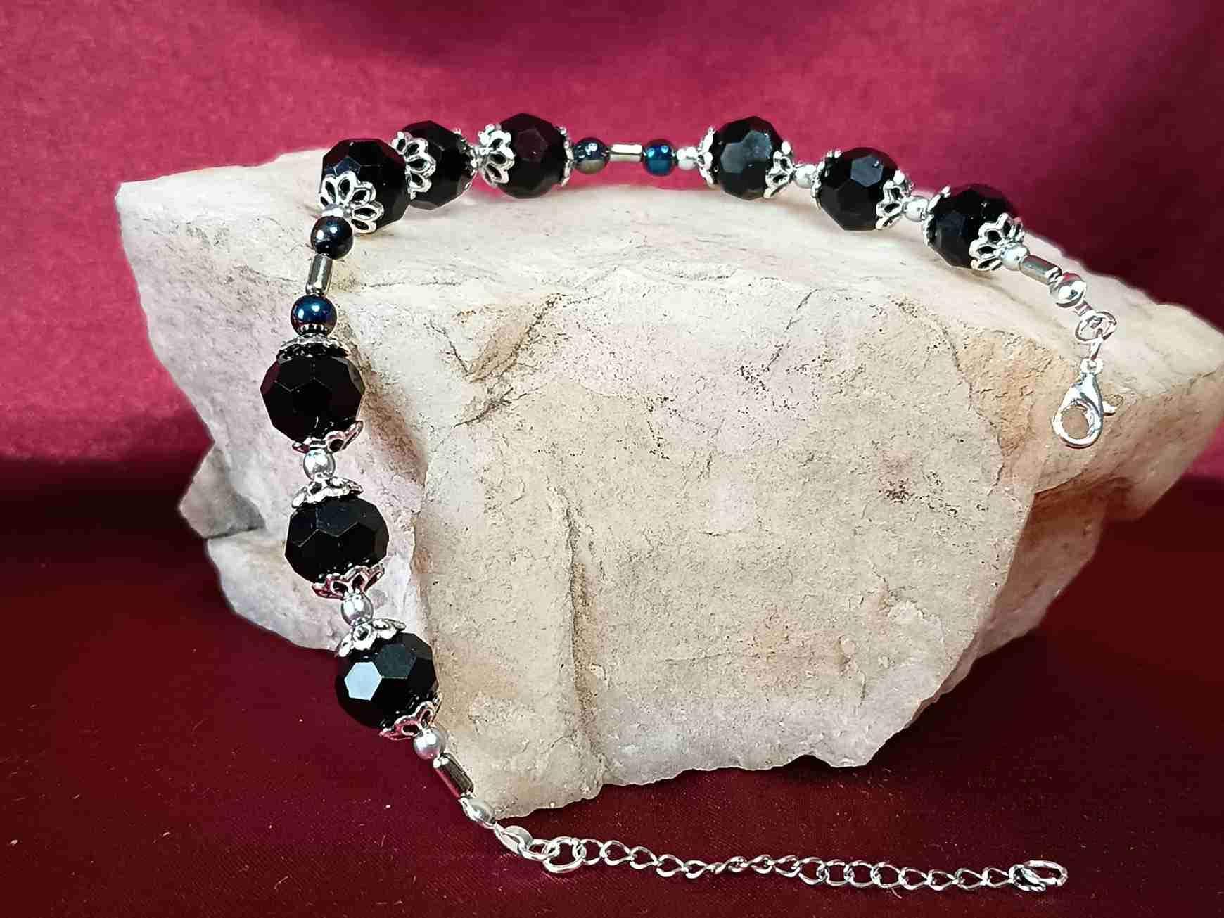 Model został wykonany z fasetowanych, czarnych kryształów osadzonych w ozdobnych, srebrzystych przekładkach.
