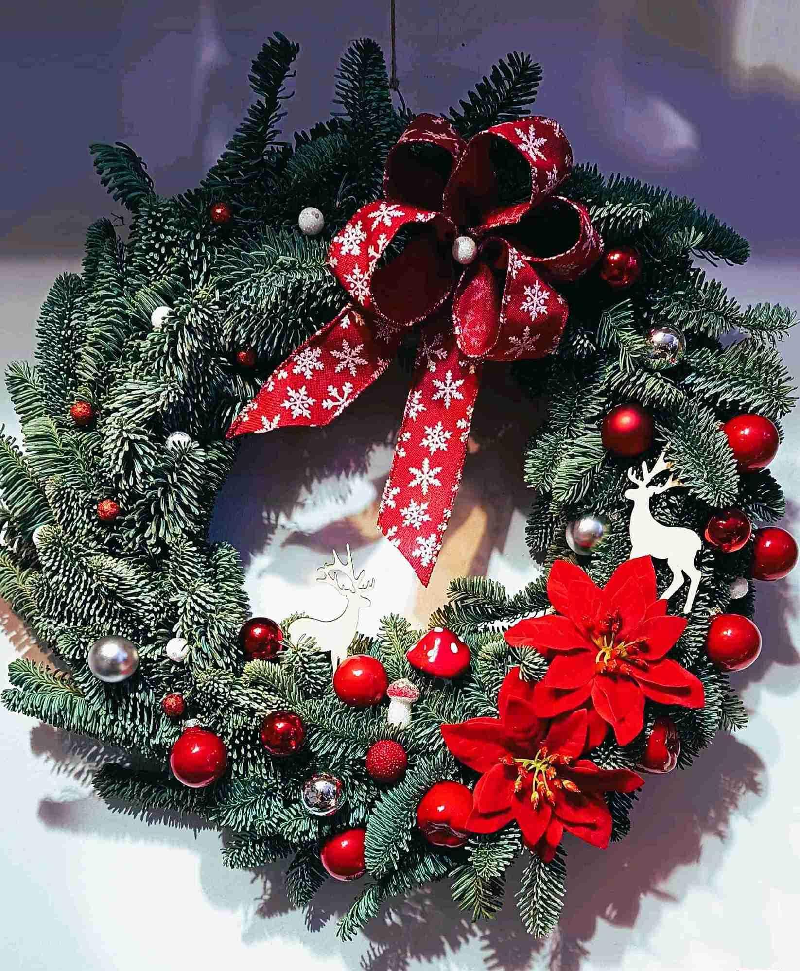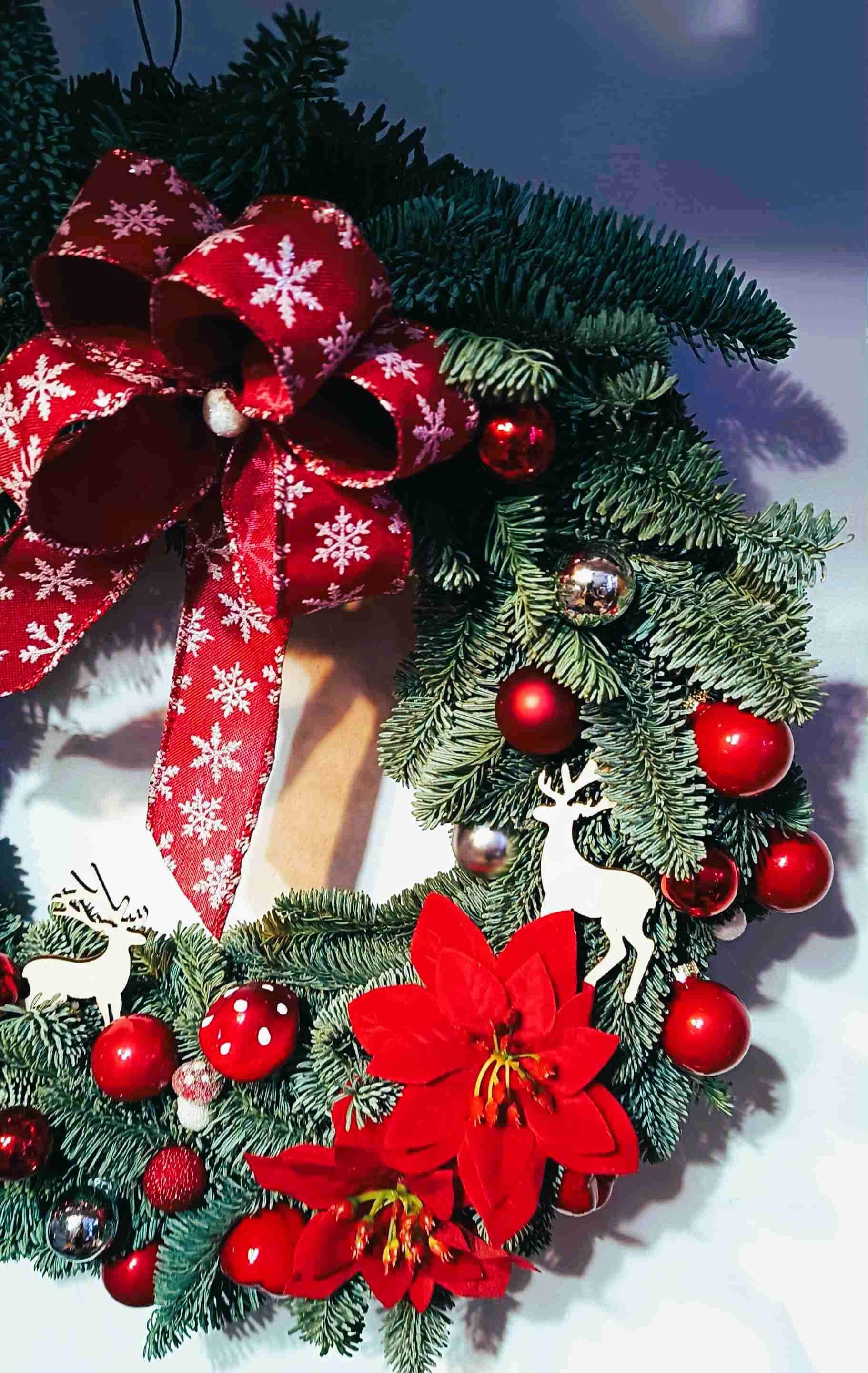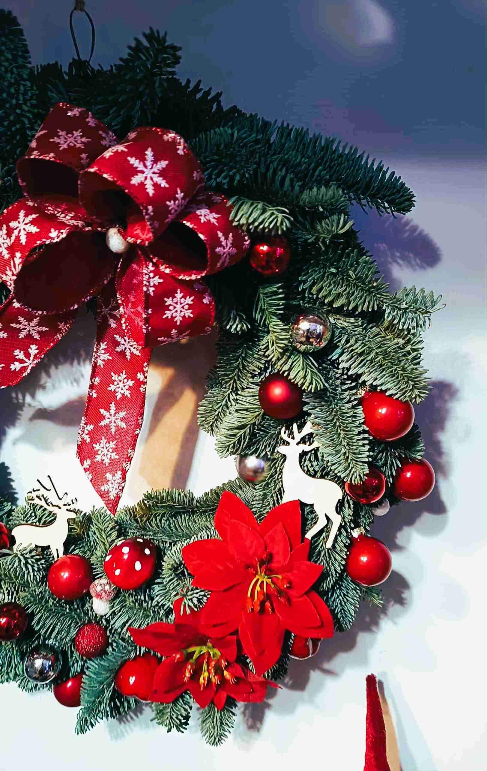 Dwa kwiaty gwiazdy betlejemskiej oraz dwa małe drewniane renifery, u góry ozdobna czerwono-srebrna kokarda.