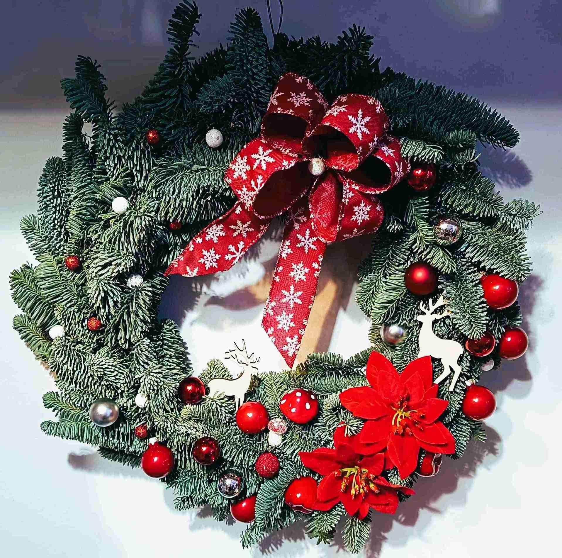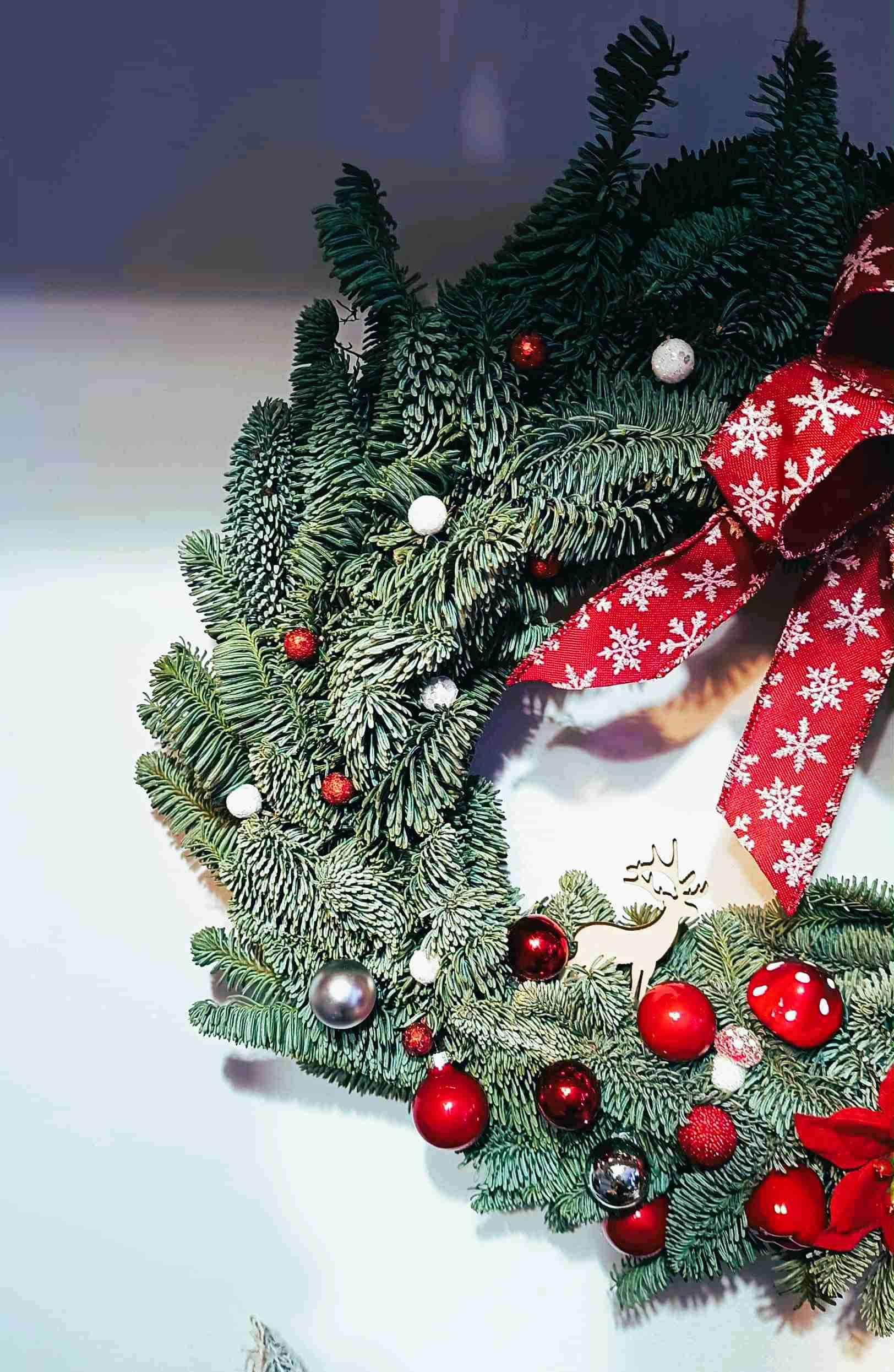 Dekoracja wianka to elementy w kolorze czerwonym i srebrnym.