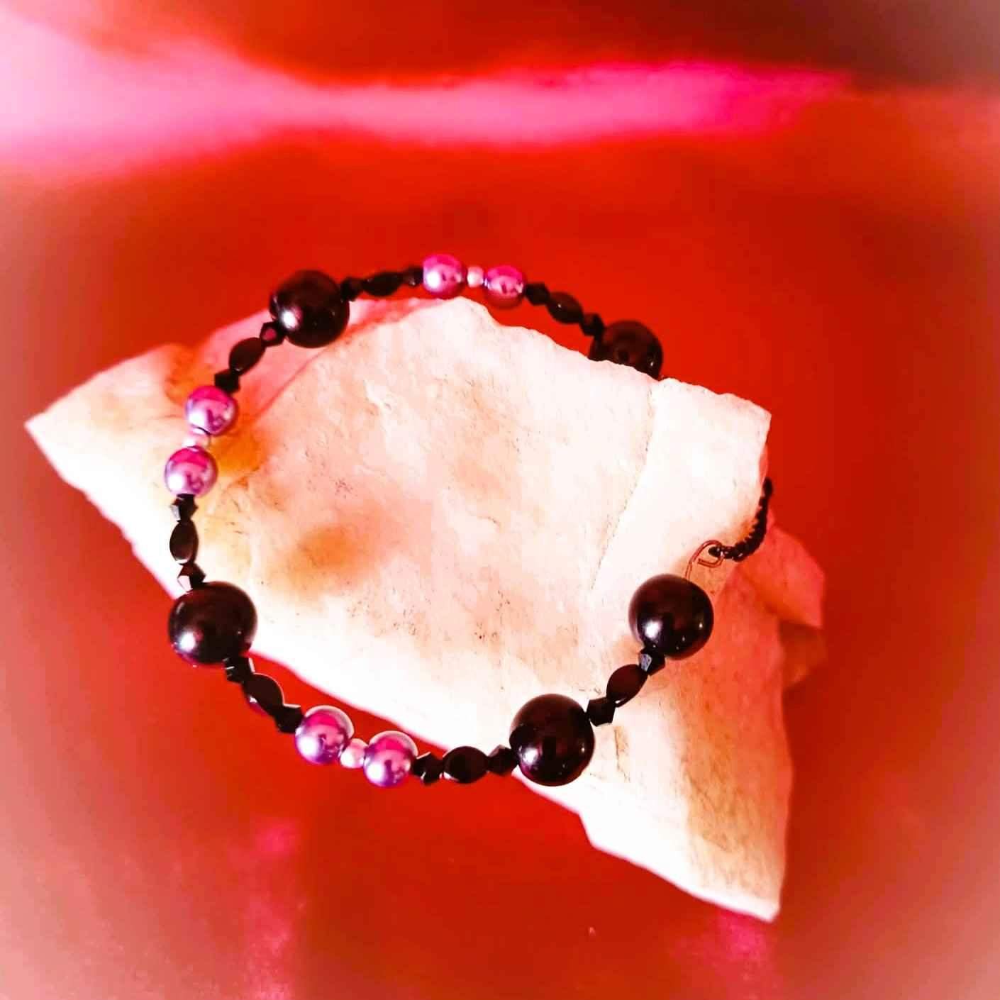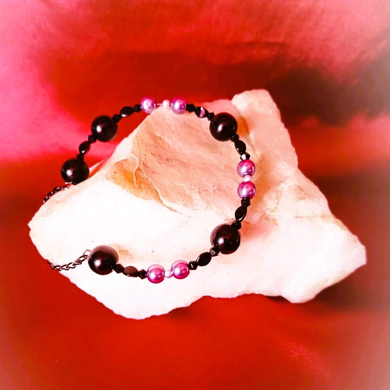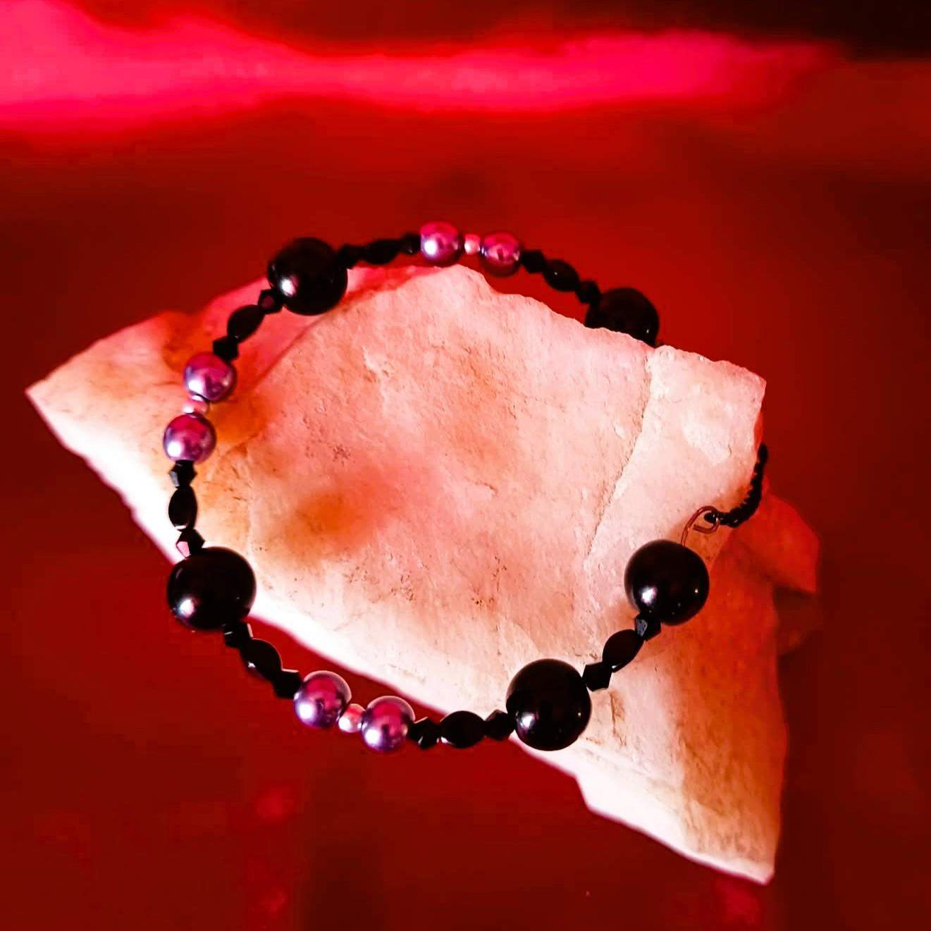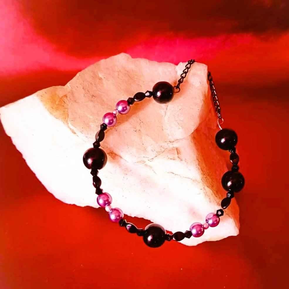 Model został wykonany z gładkich, połyskujących czarnych kul , grafitowych perełek oraz czarnych fasetowanych czarnych kryształków