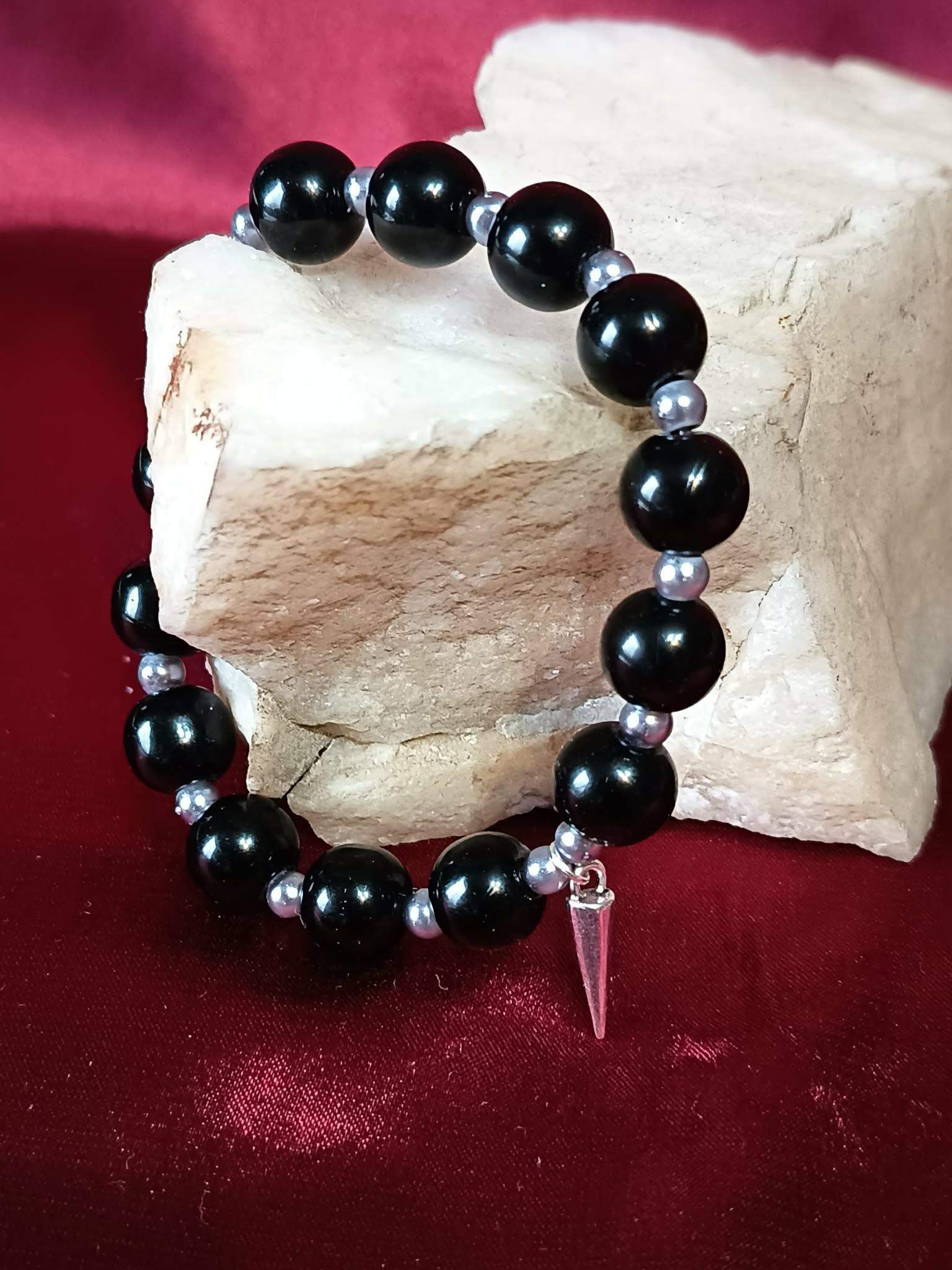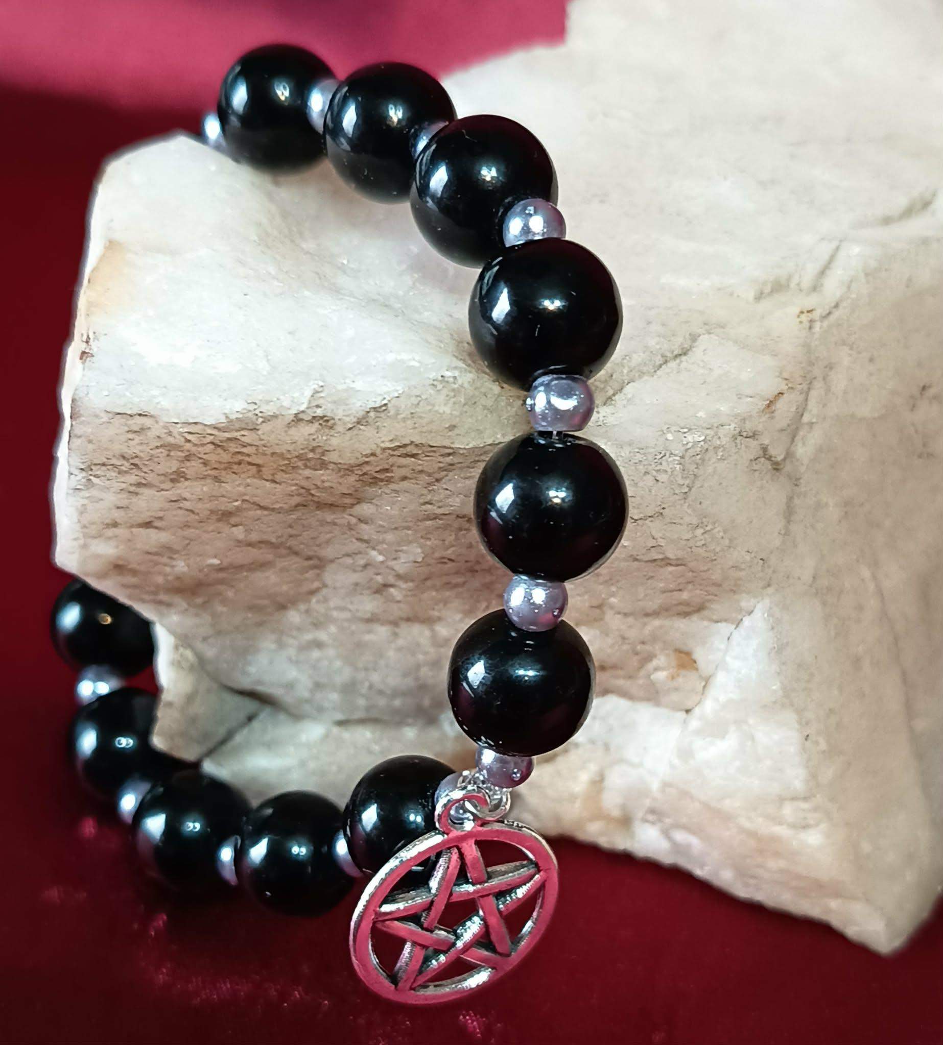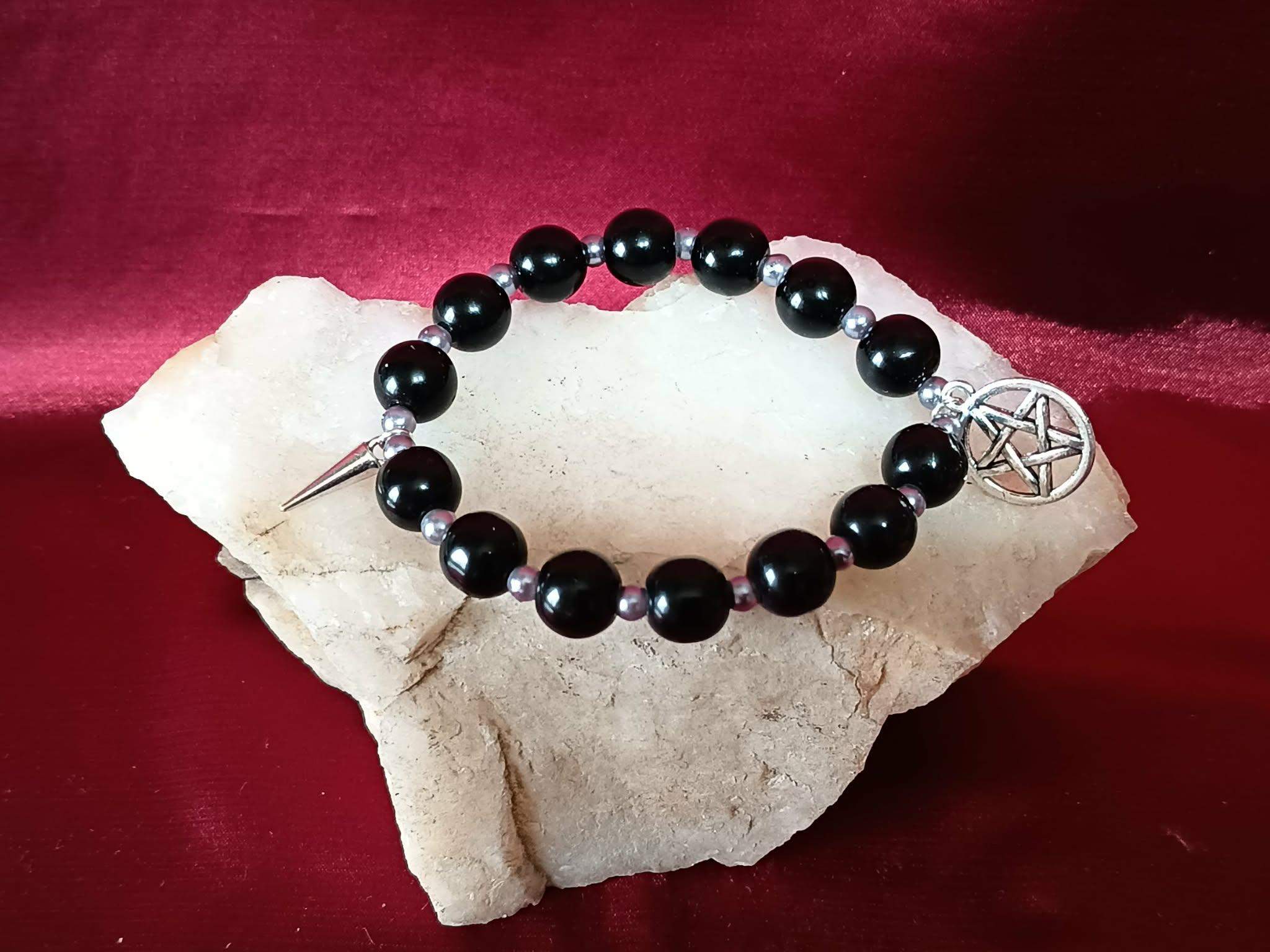 Model został wykonany z gładkich, połyskujących, czarnych pereł, przełożonych małymi grafitowymi perełkami. Dwie zawieszki " sopel i pentagram w kole.