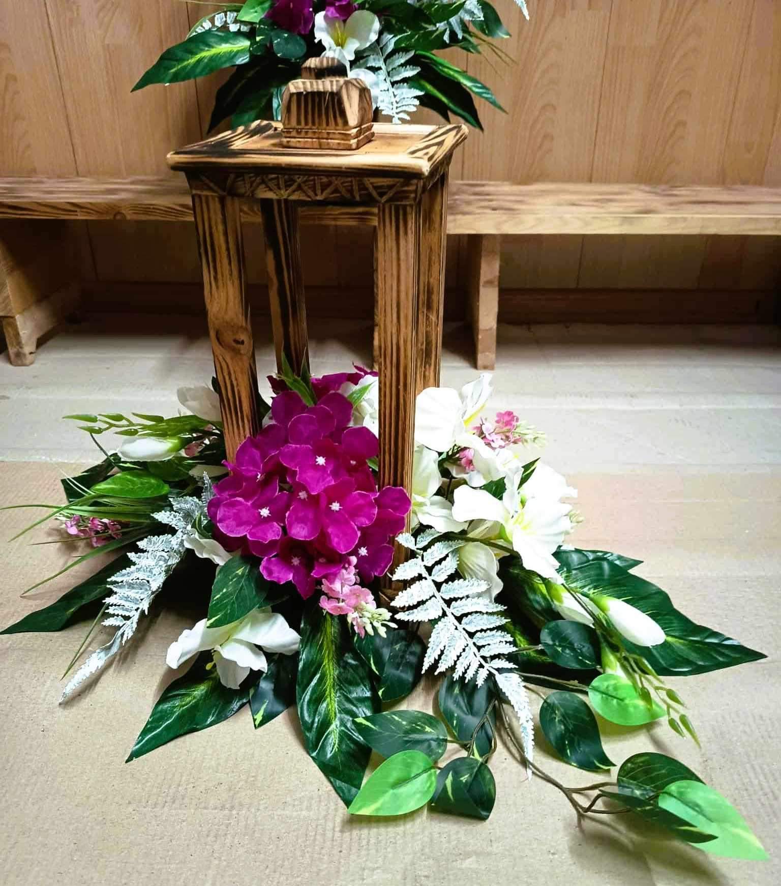 Latarnia wykonana ręcznie, opalana i impregnowany w bezbarwnym kolorze z dekoracją kwiatową.