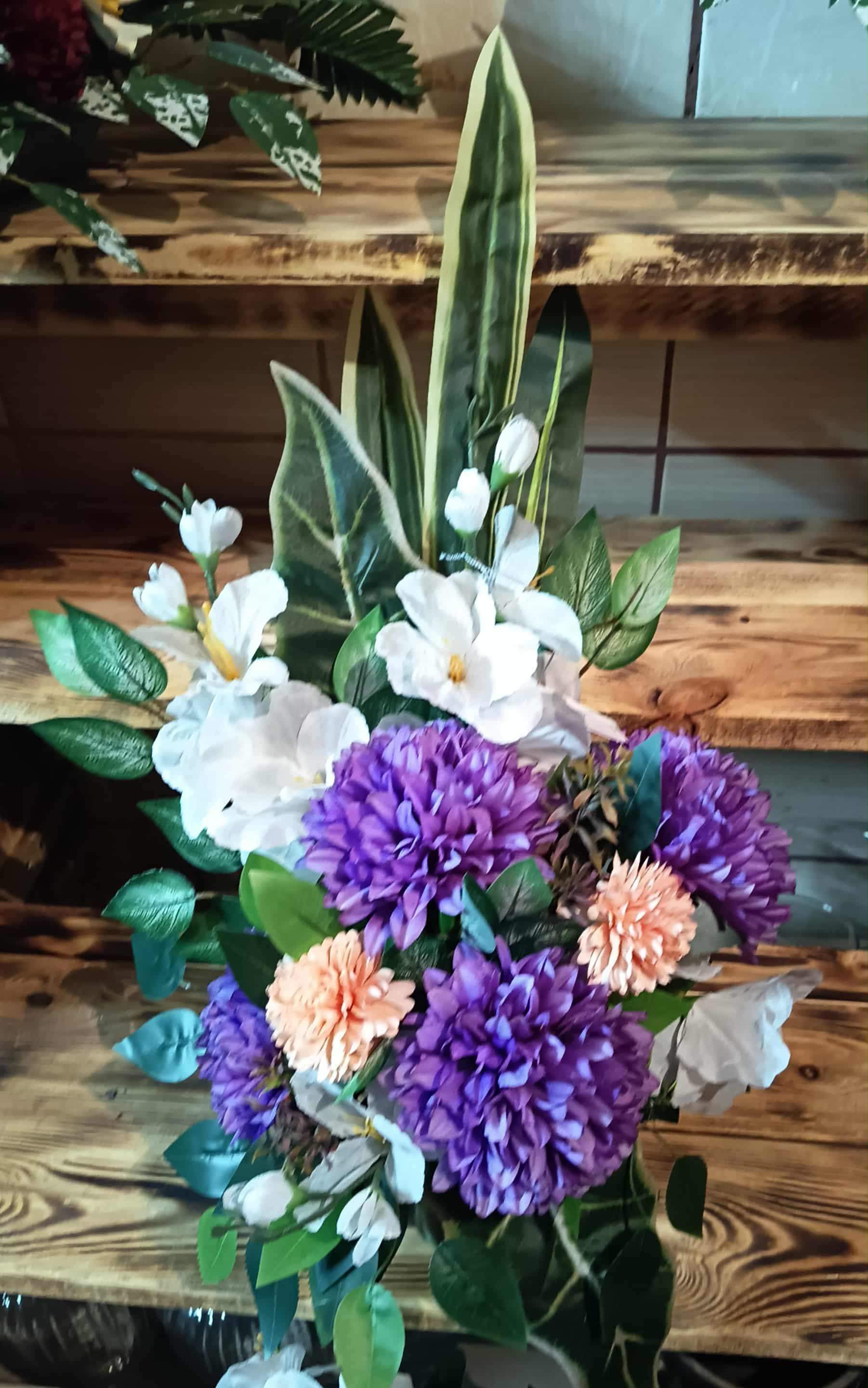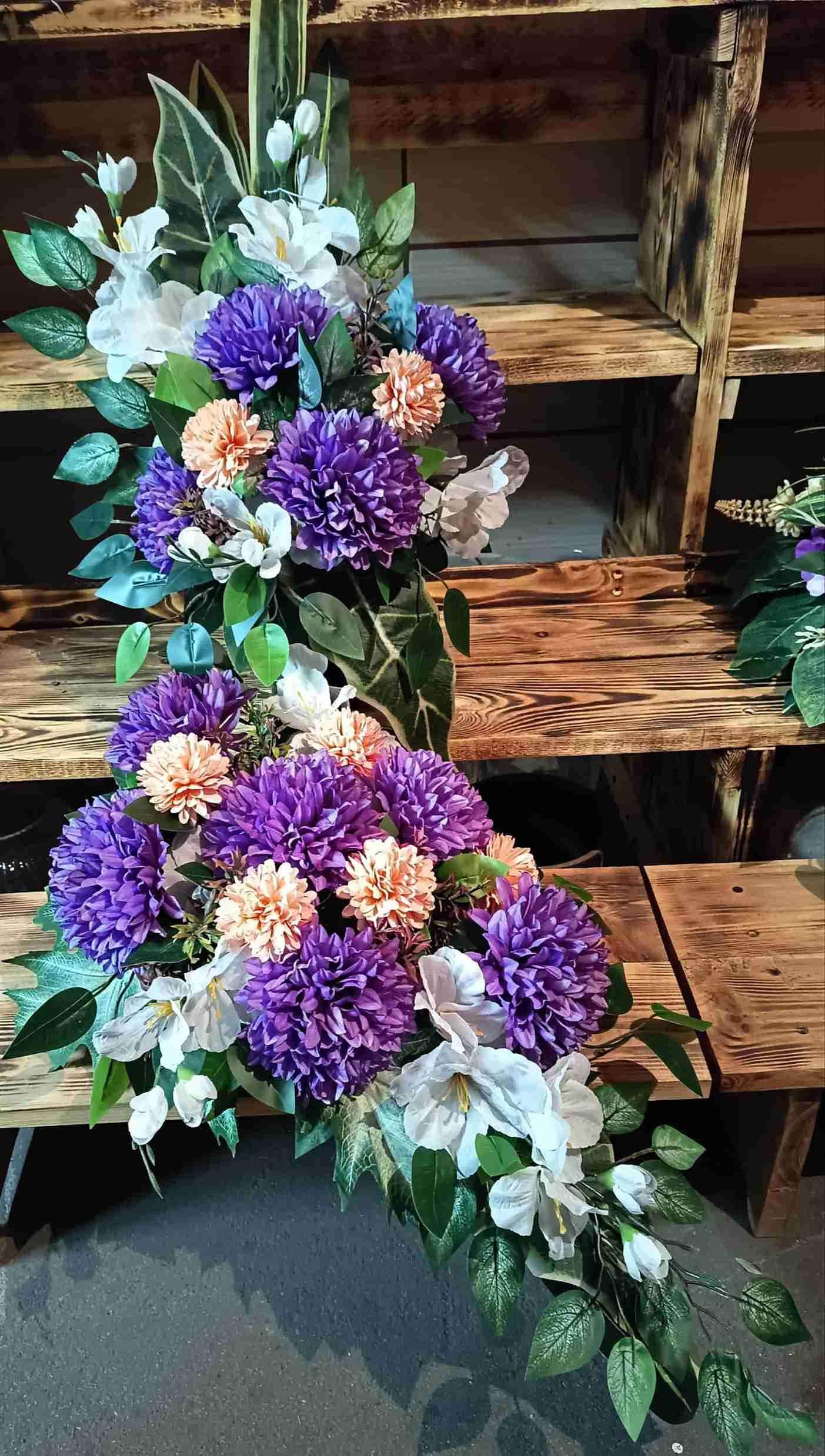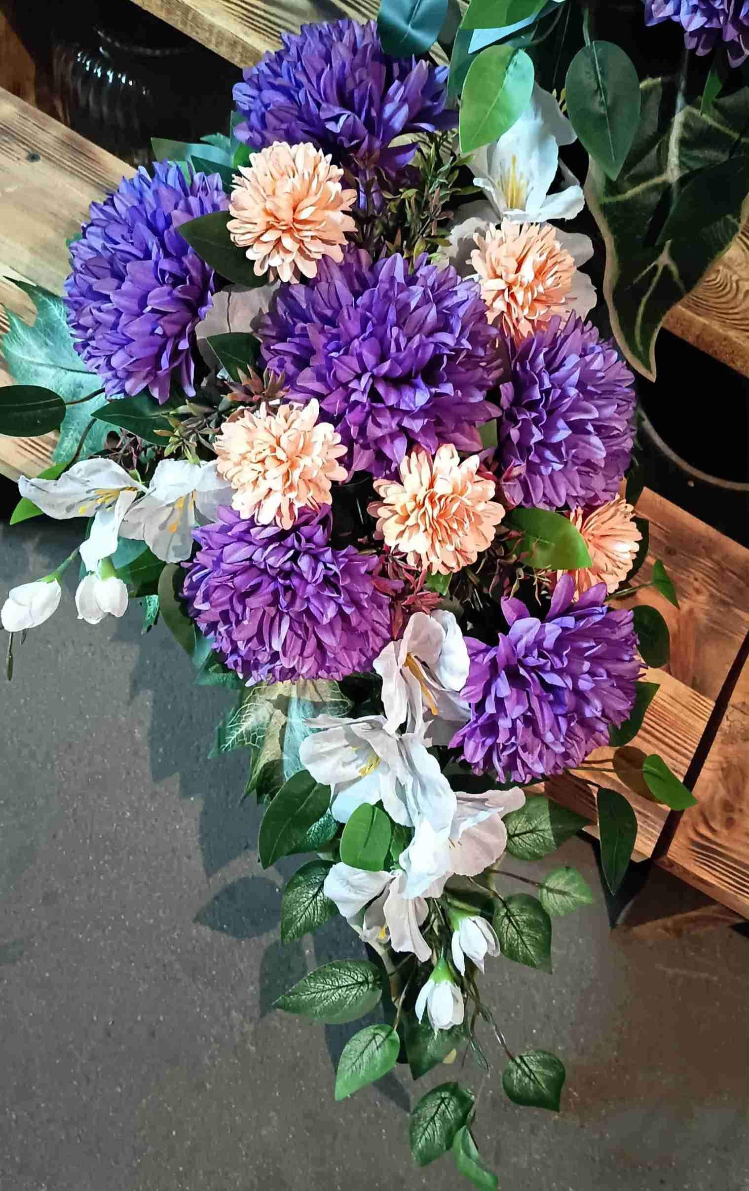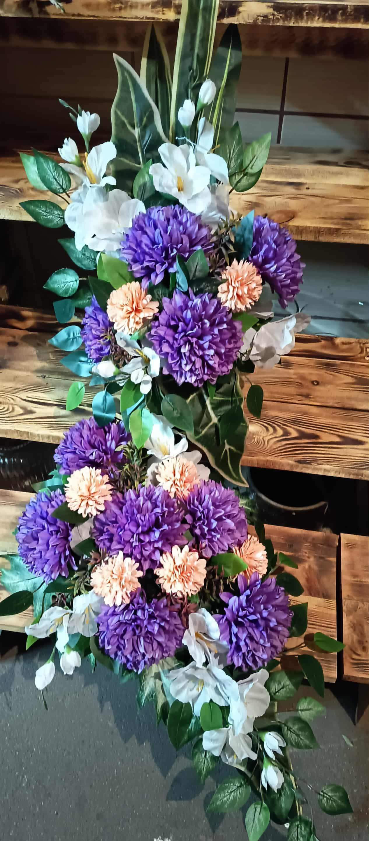 Kolorystyka - jasnofioletowe chryzantemy, białe mieczyki oraz łososiowe czosnki z zielenią.