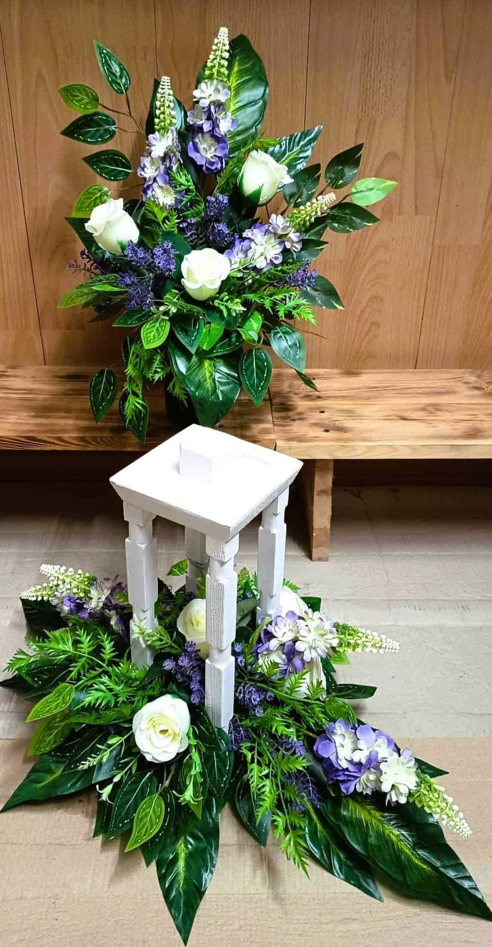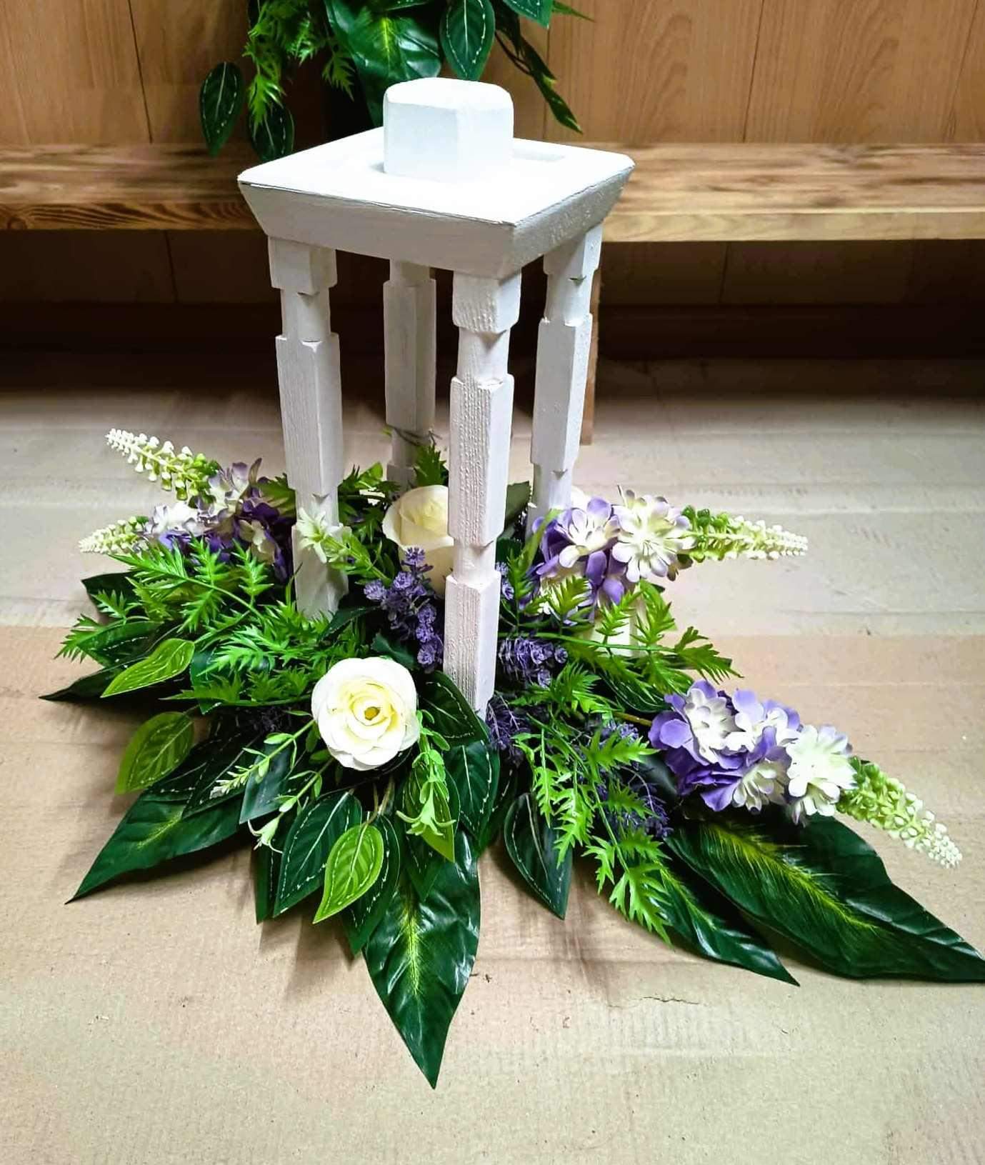 Drewniana latarnia, wykonana ręcznie, impregnowana w kolorze bieli z dekoracją kwiatową.