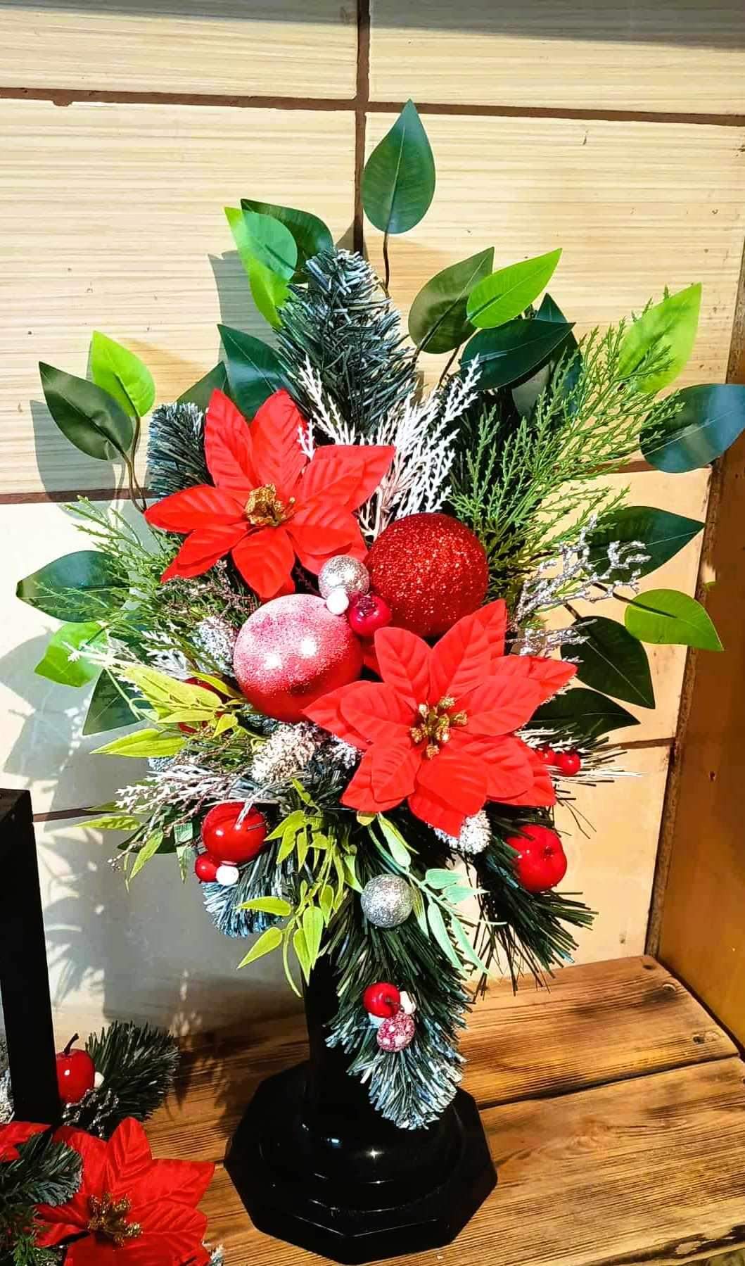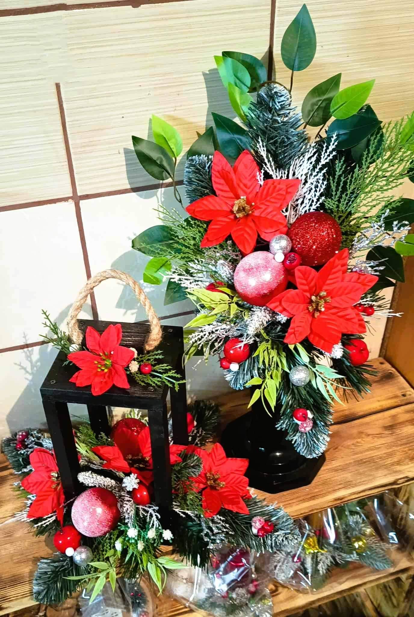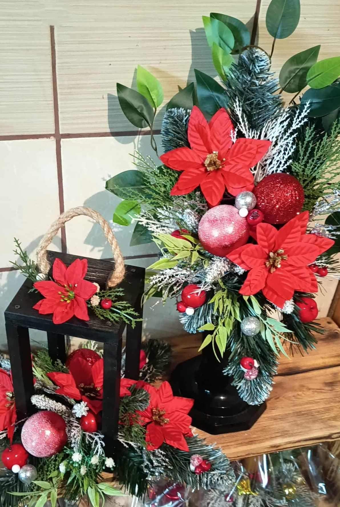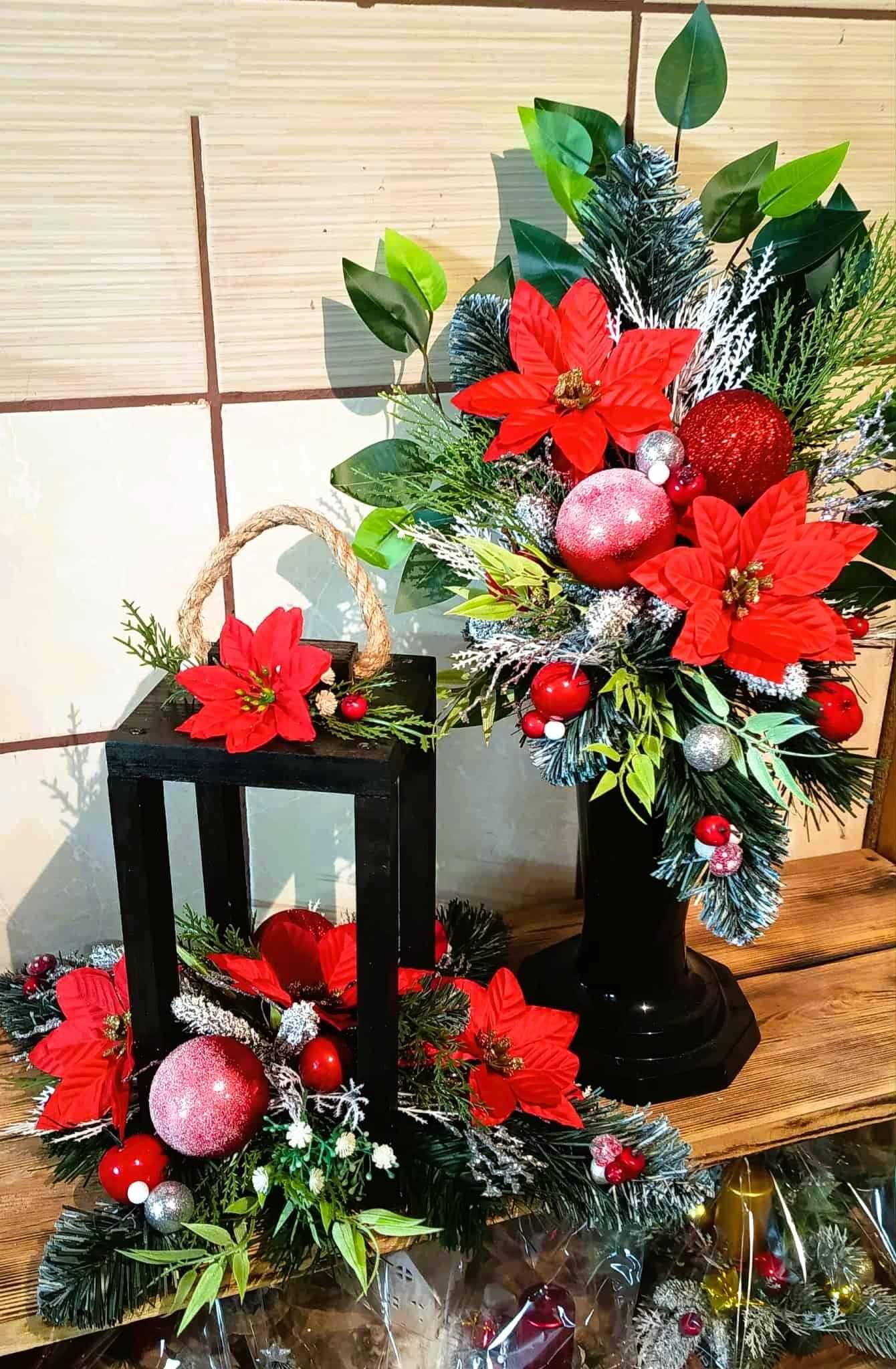 Kwiaty czerwonej gwiazdy betlejemskiej oraz bombki i drobne elementy dekoracyjne w kolorystyce czerwonej i srebrnej.
