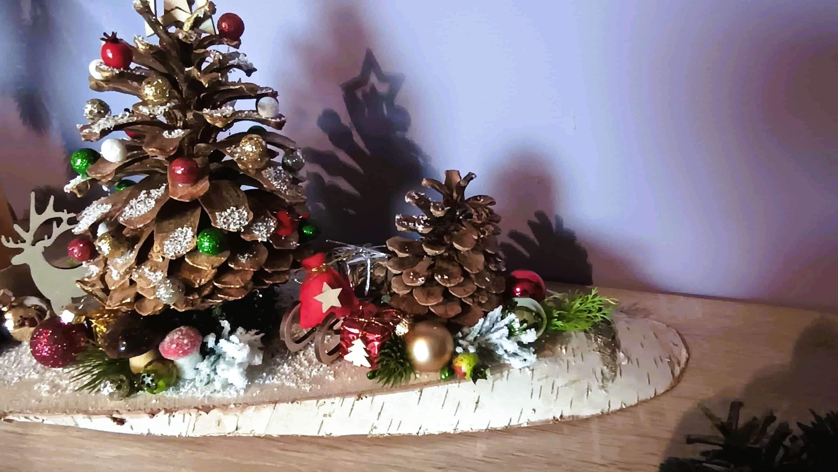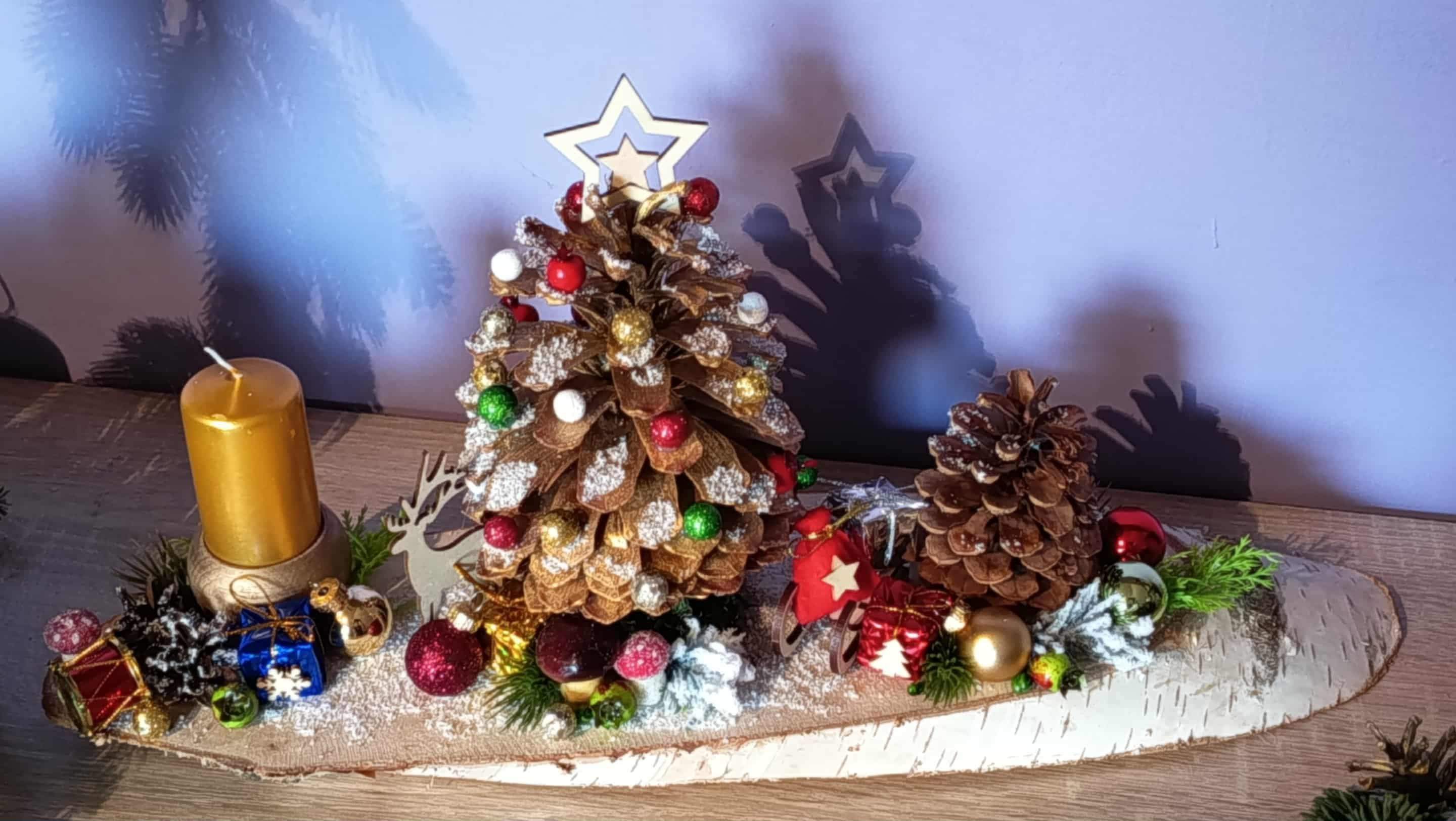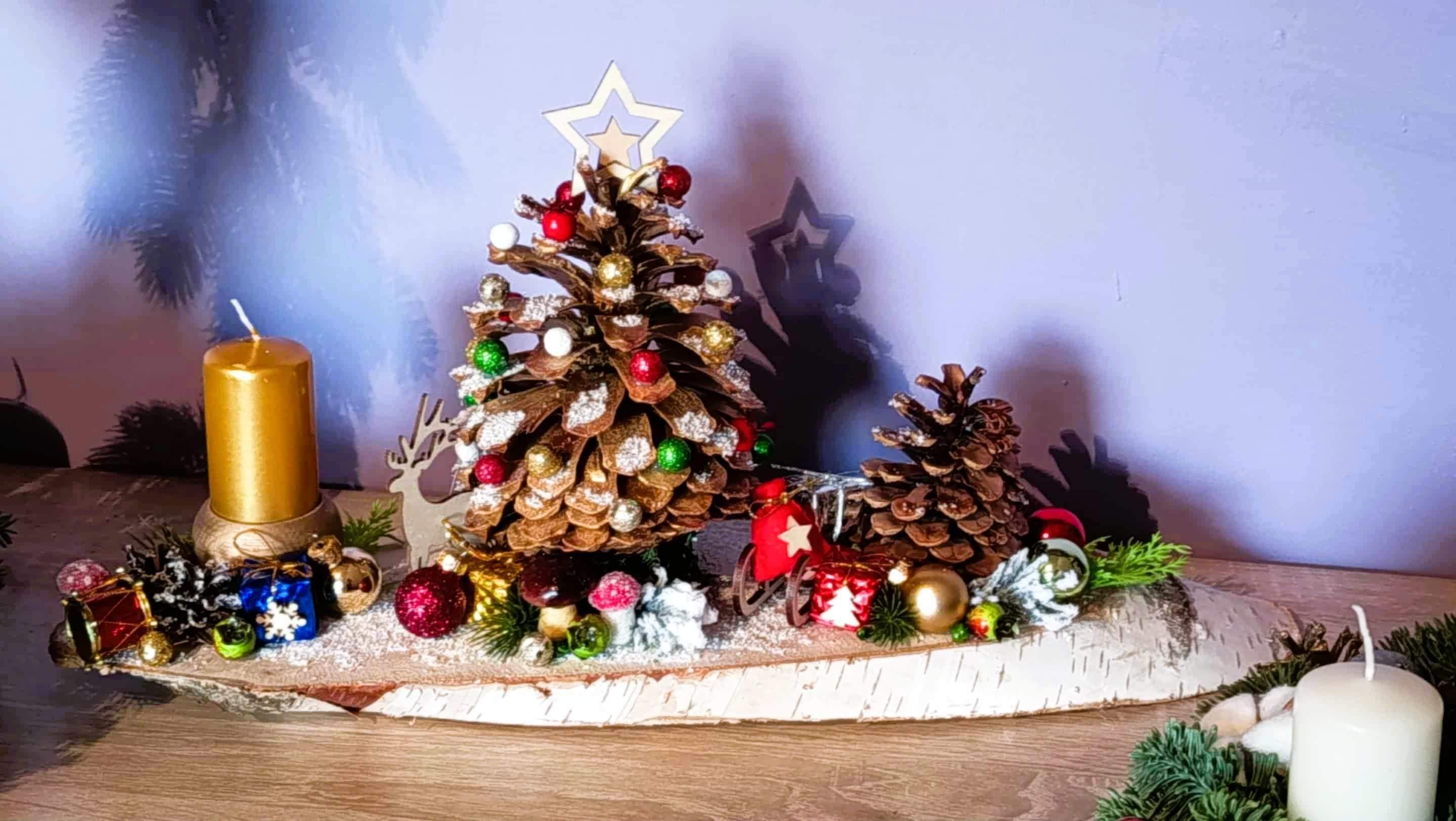 Dekoracja na długim plastrze brzozy - stroik ze świecą i dużą szyszką.