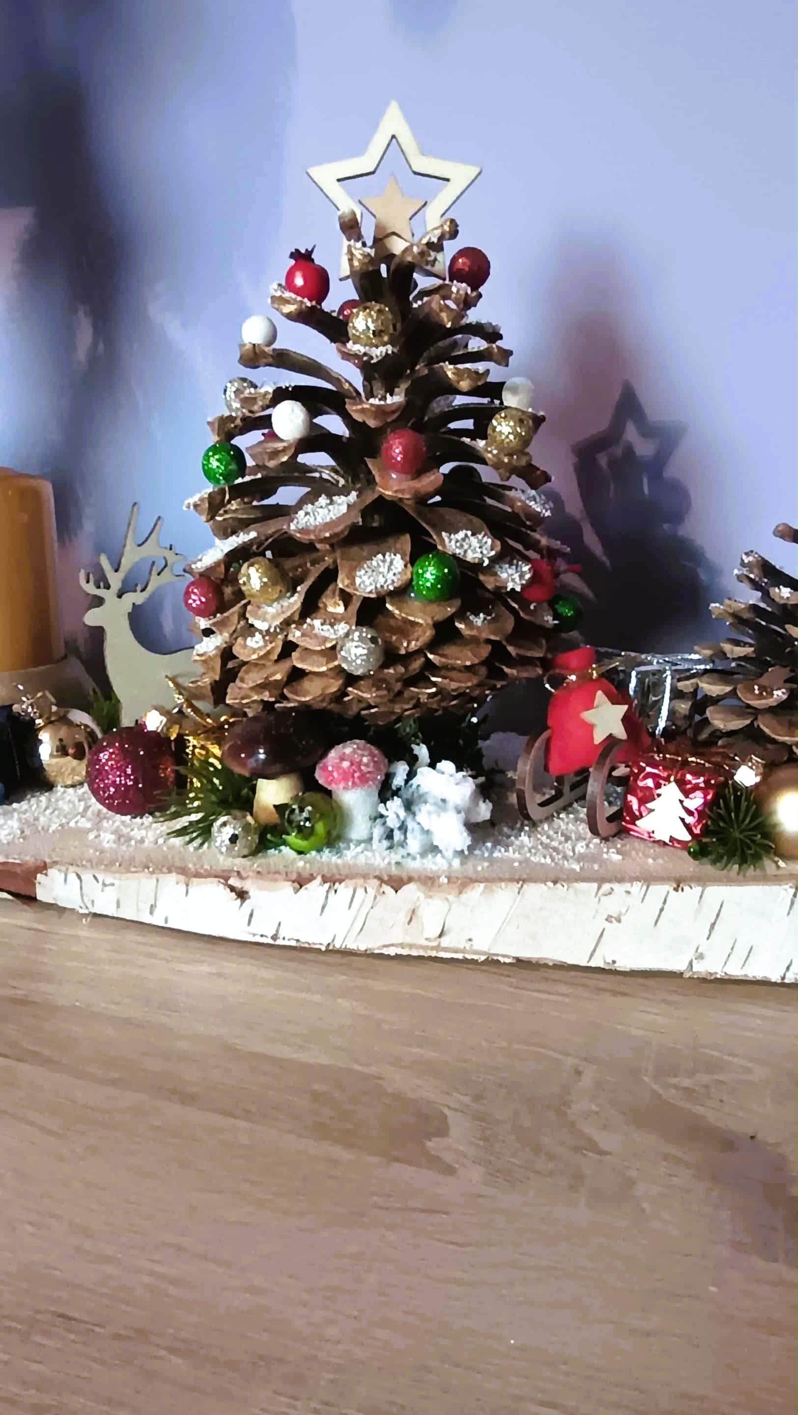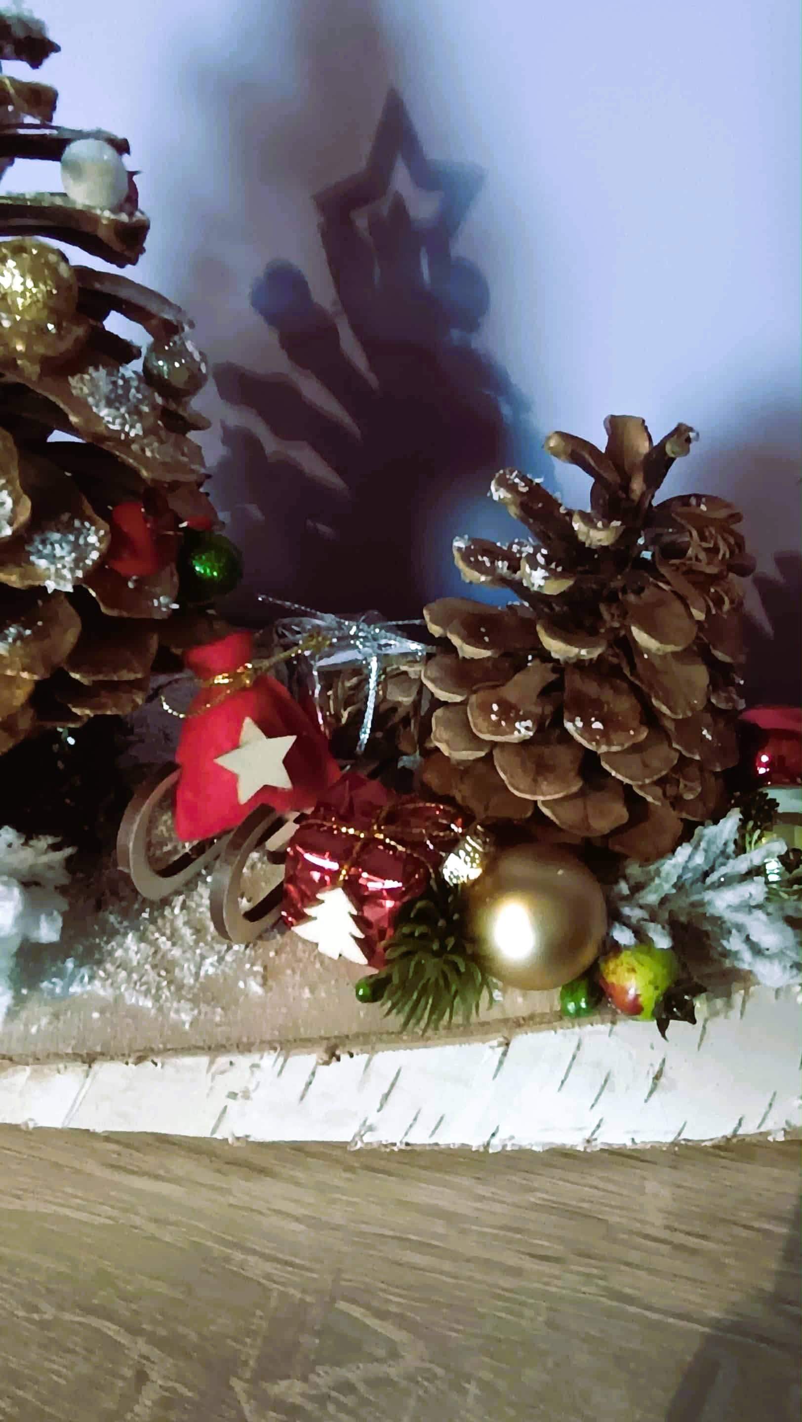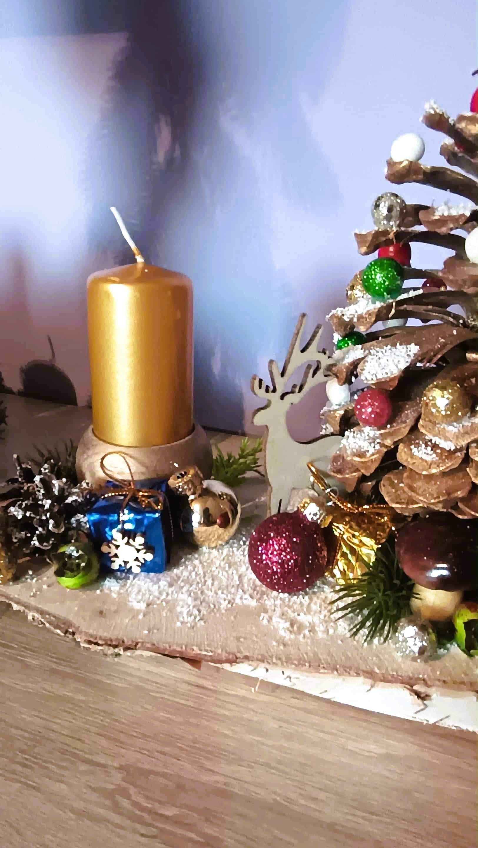 Dekoracja na długim plastrze brzozy - stroik ze świecą i dużą szyszką.