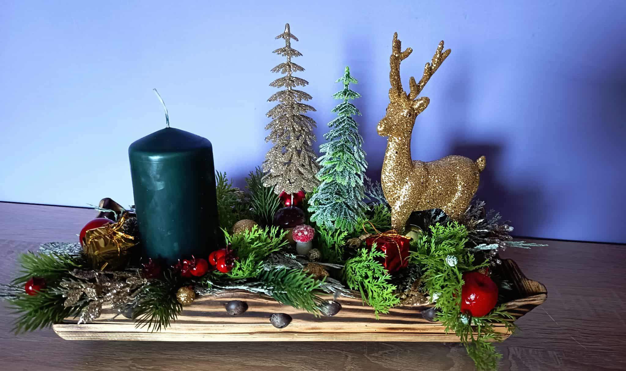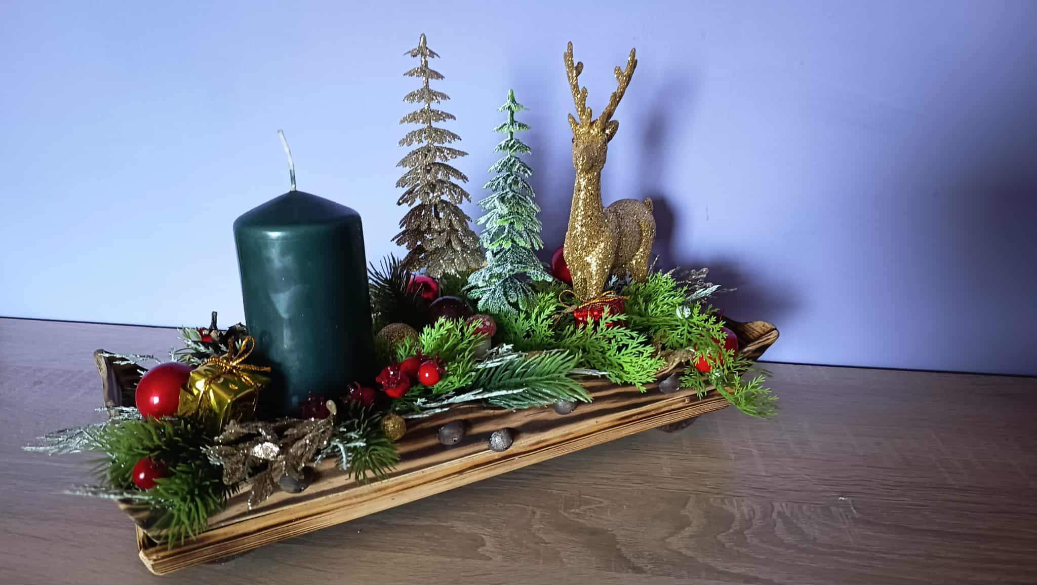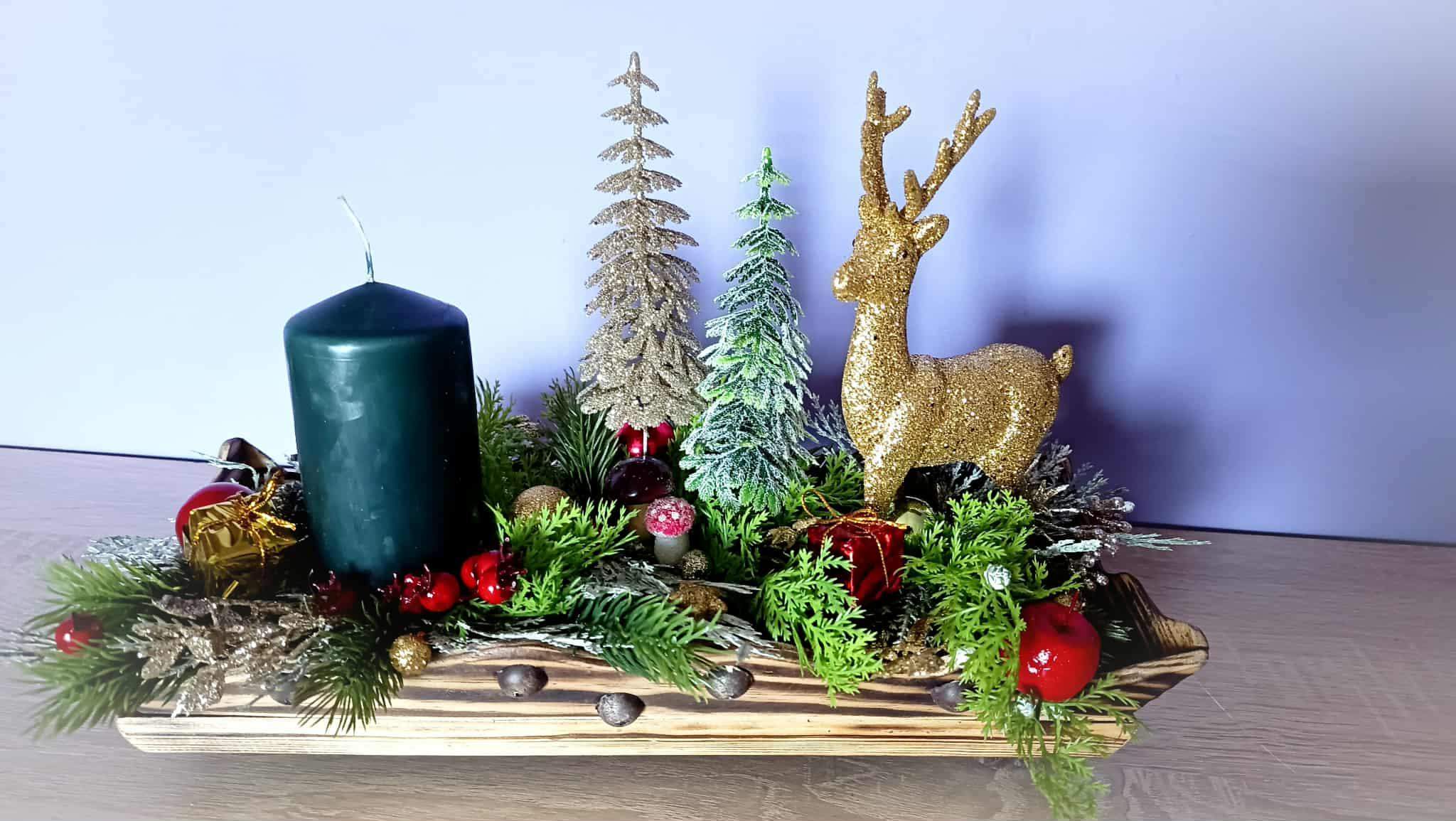 Dekorację stanowi renifer oraz elementy takie bombki, sztuczne choinki, gałązki świerkowe czy drobne elementy dekoracyjne.