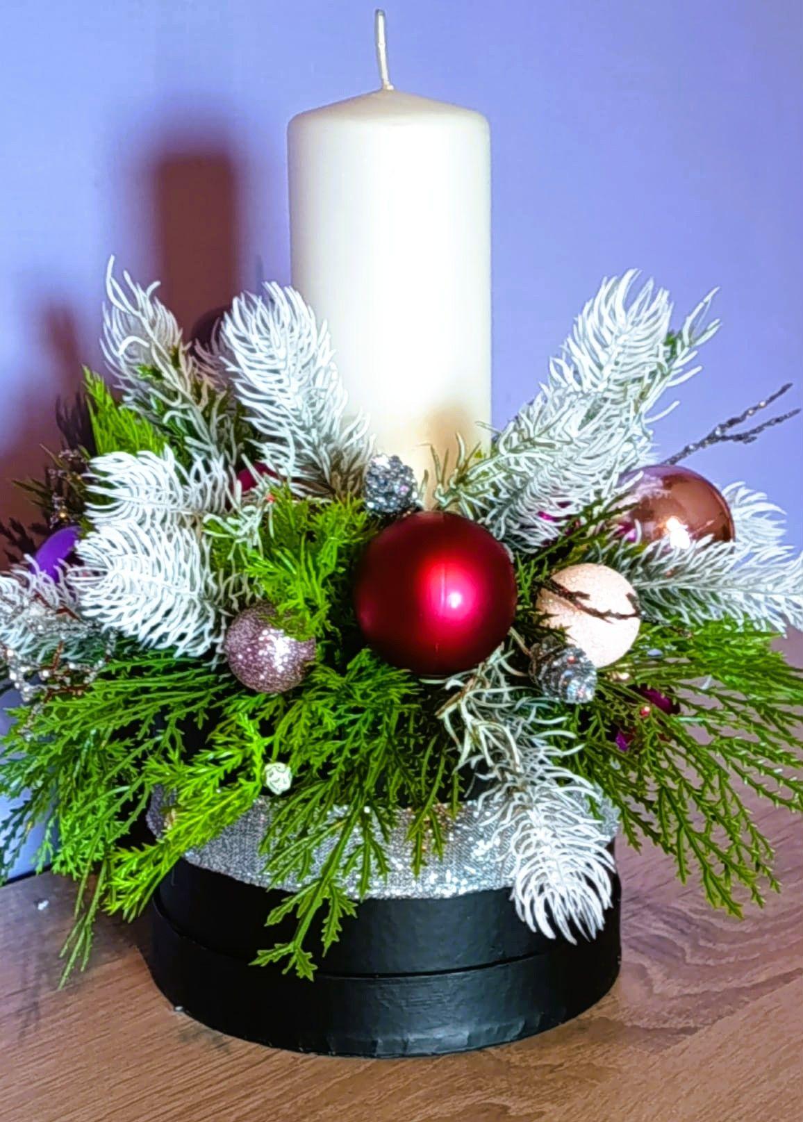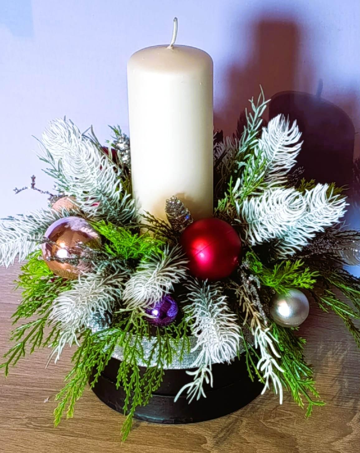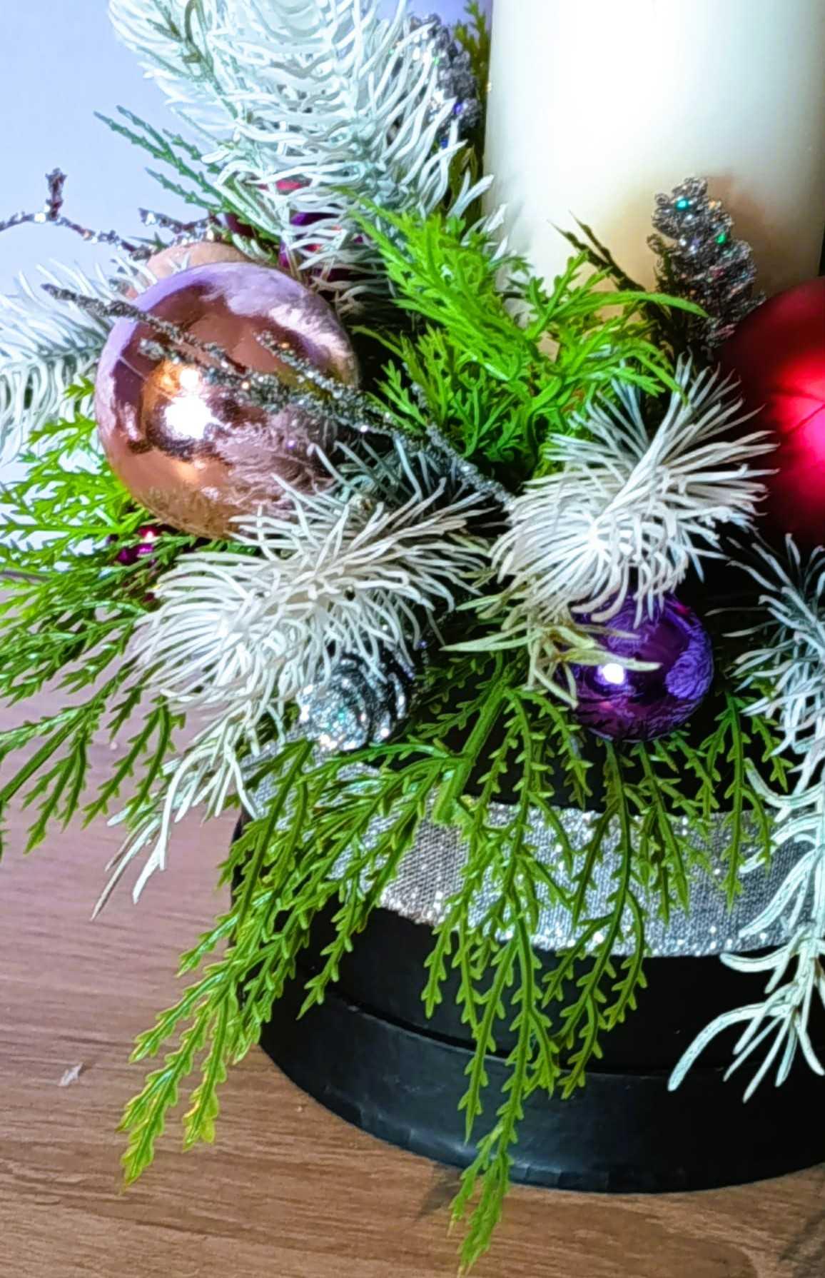 Sztuczne gałązki świerku w kolorach zieleni i bieli, kolorowe bombki i elementy dekoracyjne.