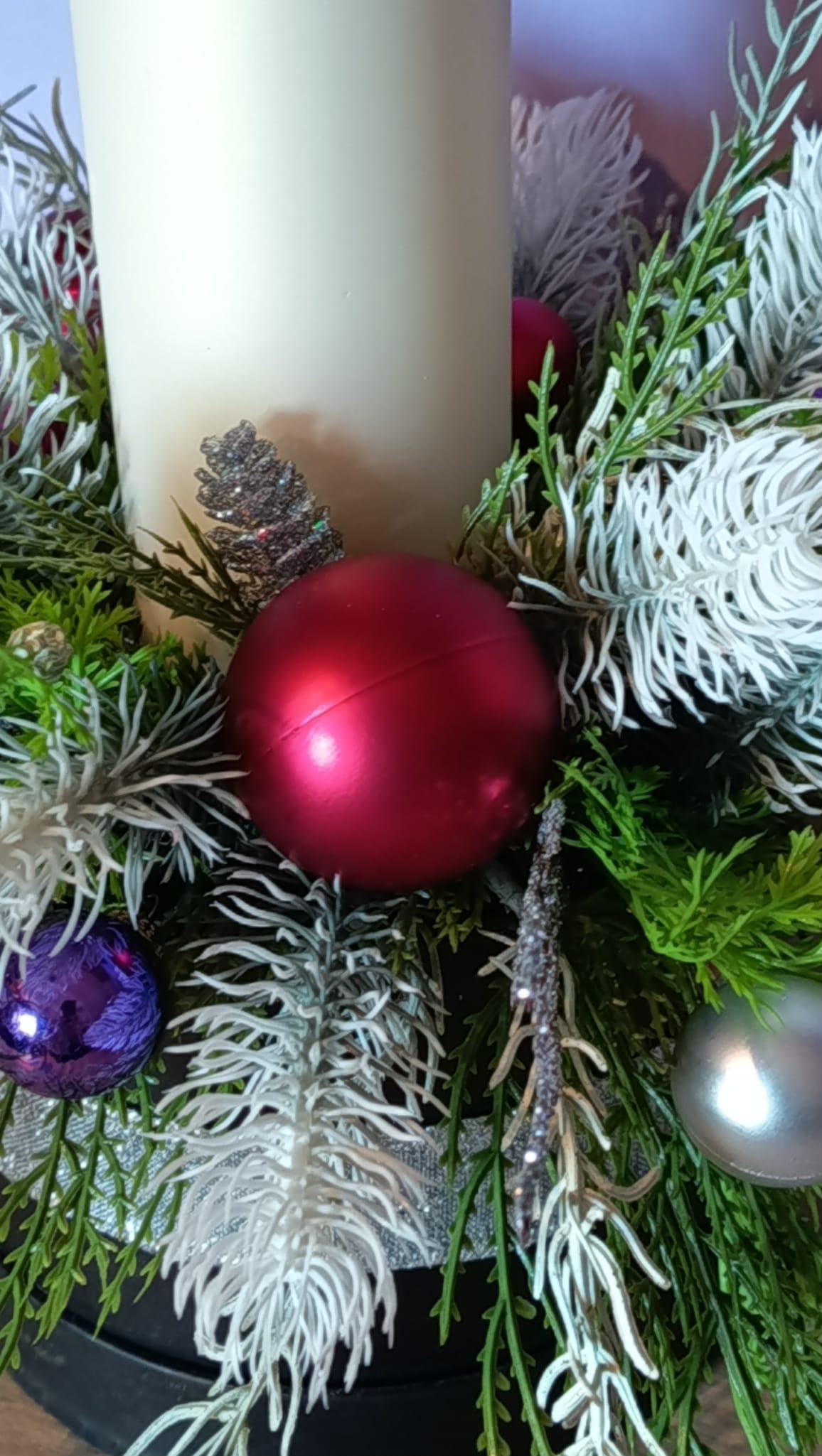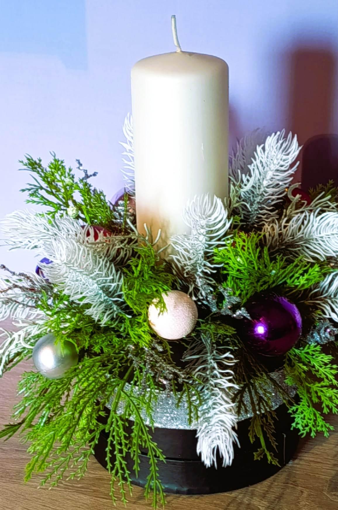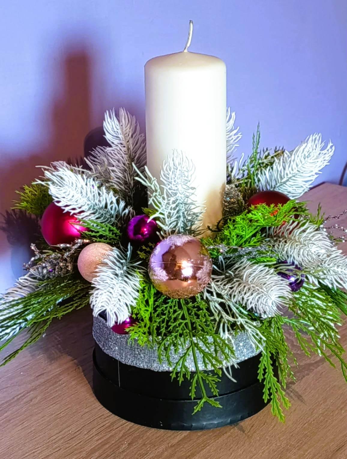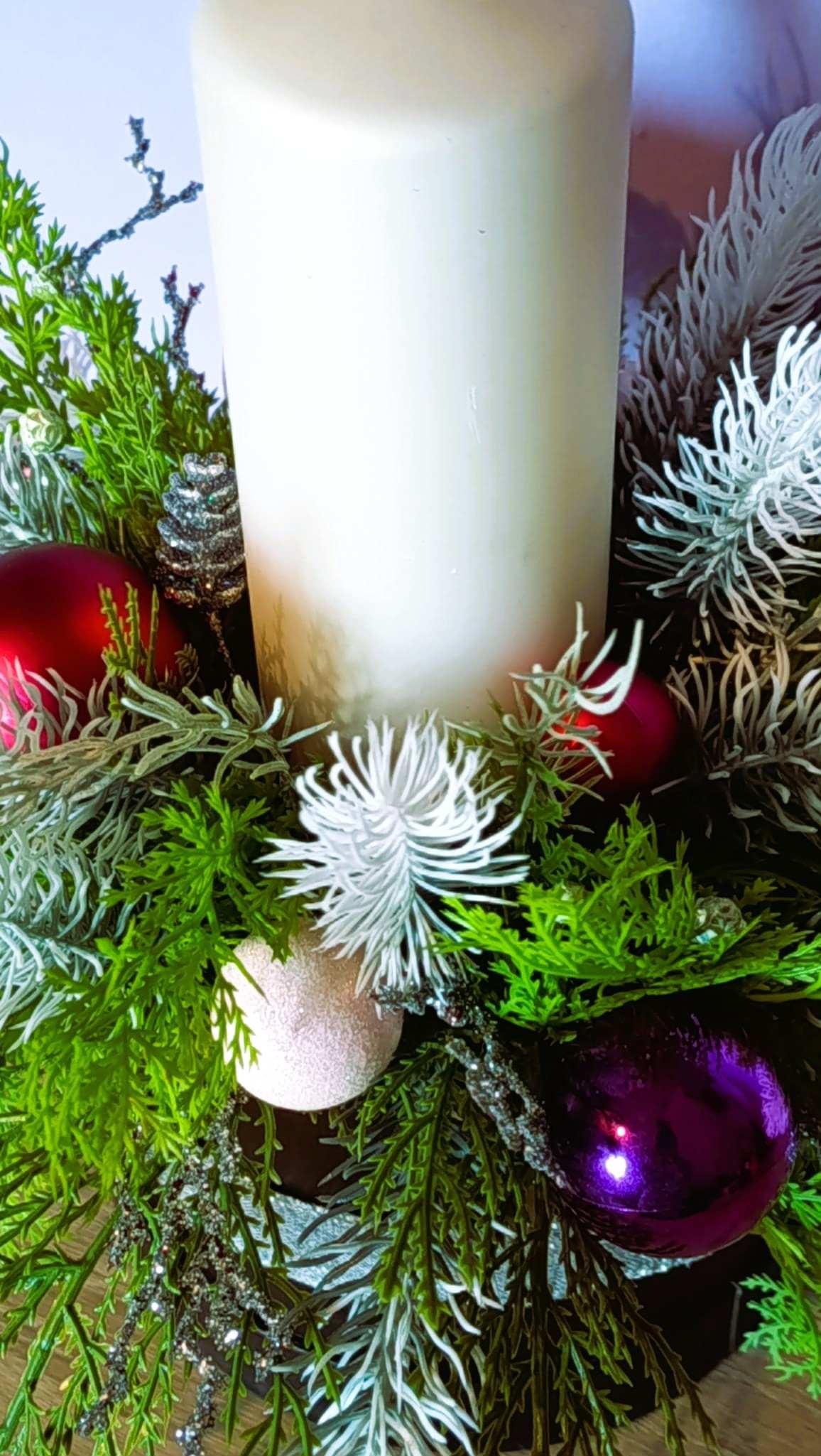 Sztuczne gałązki świerku w kolorach zieleni i bieli, kolorowe bombki i elementy dekoracyjne.