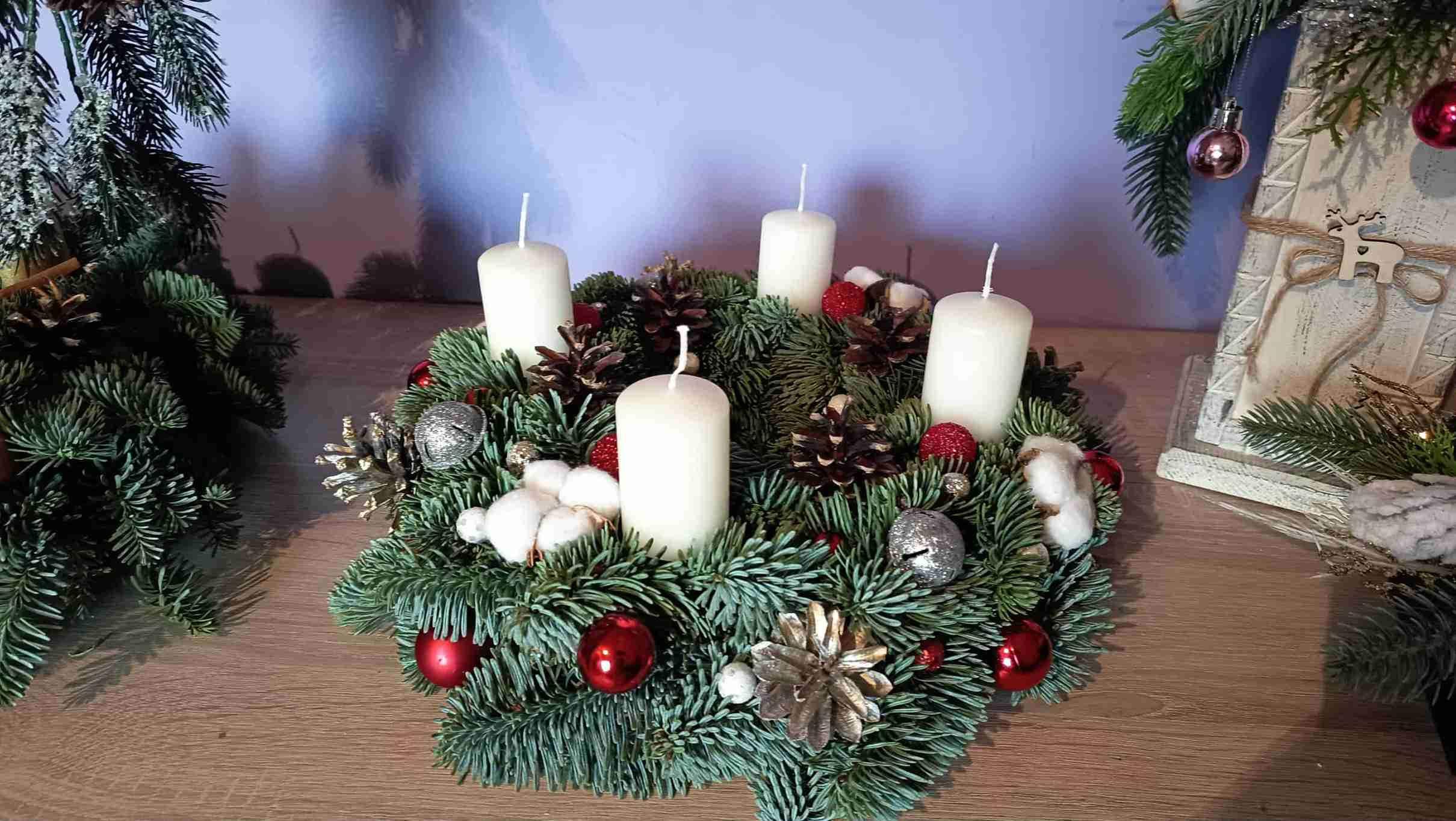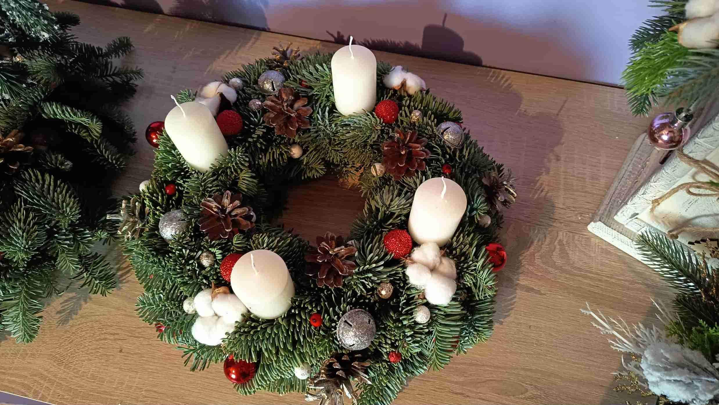 Wianek adwentowy z żywej jodły nobilis kolorystyka - biel z czerwonymi i srebrnymi dodatkami.