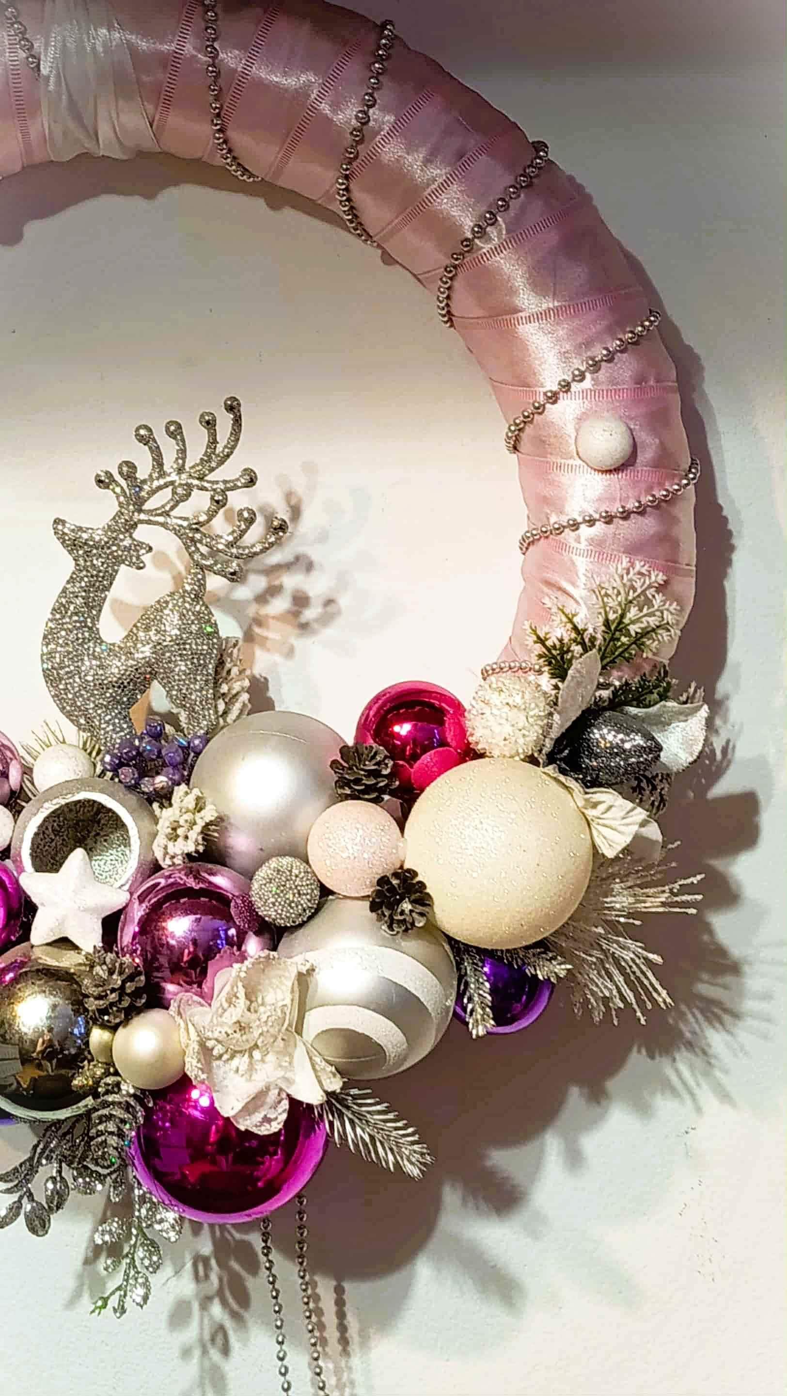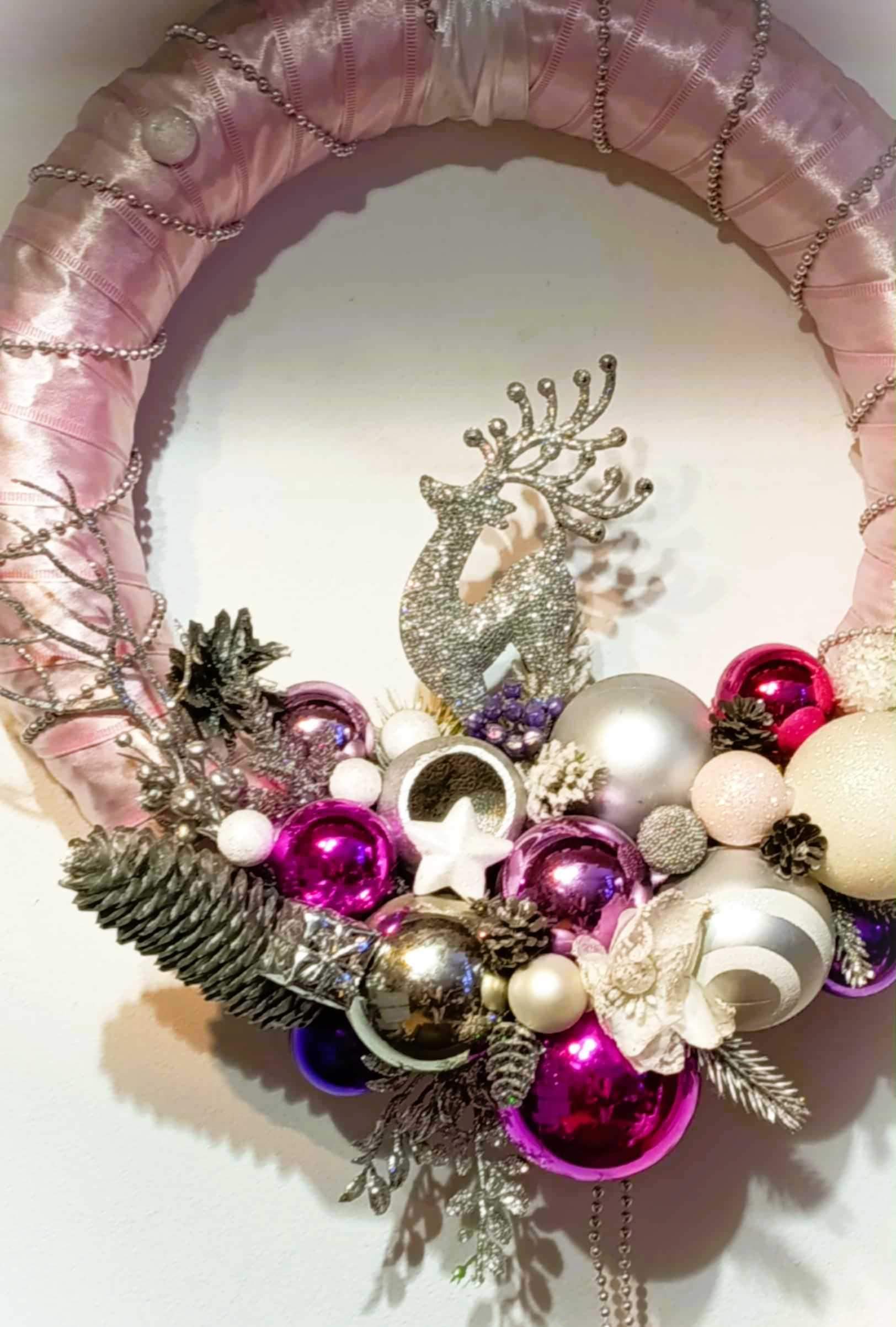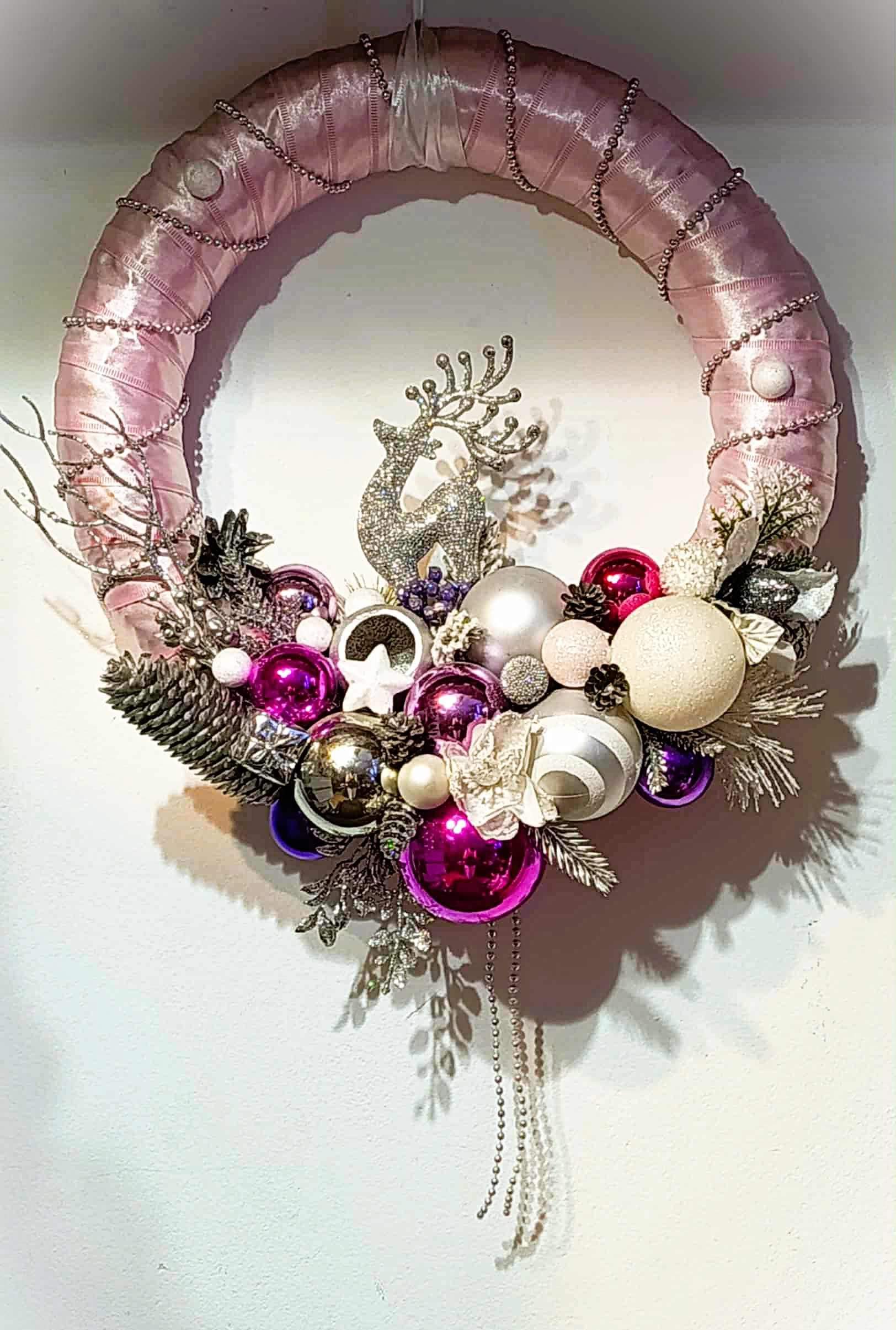 Wianek bożonarodzeniowy o średnicy 35cm, wykonany na bazie wianka słomianego, owinięty różową, atłasową wstążką z dekoracją z bombek, szyszek oraz renifera utrzymany w kolorystyce biało-srebrno-różowej.