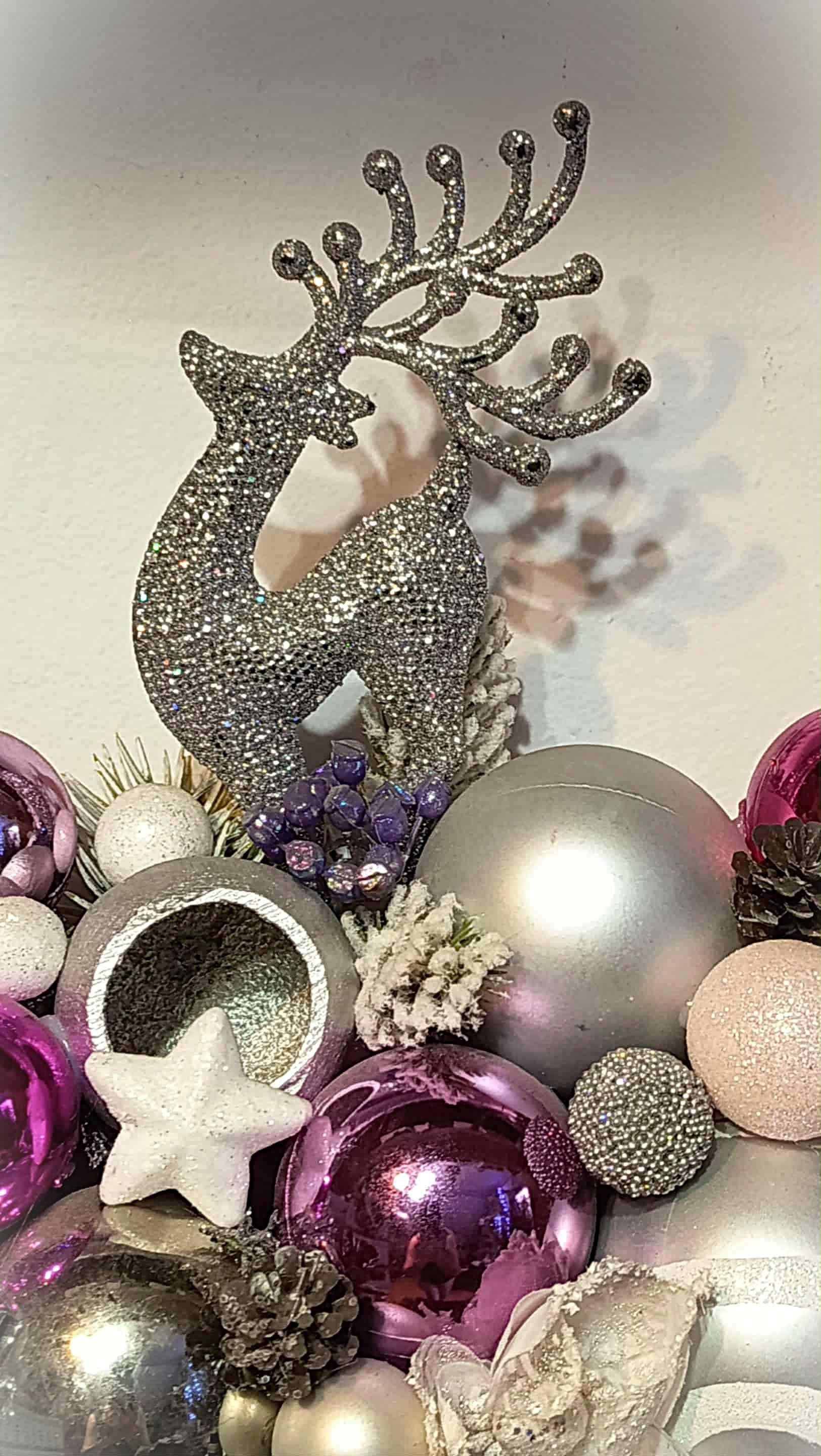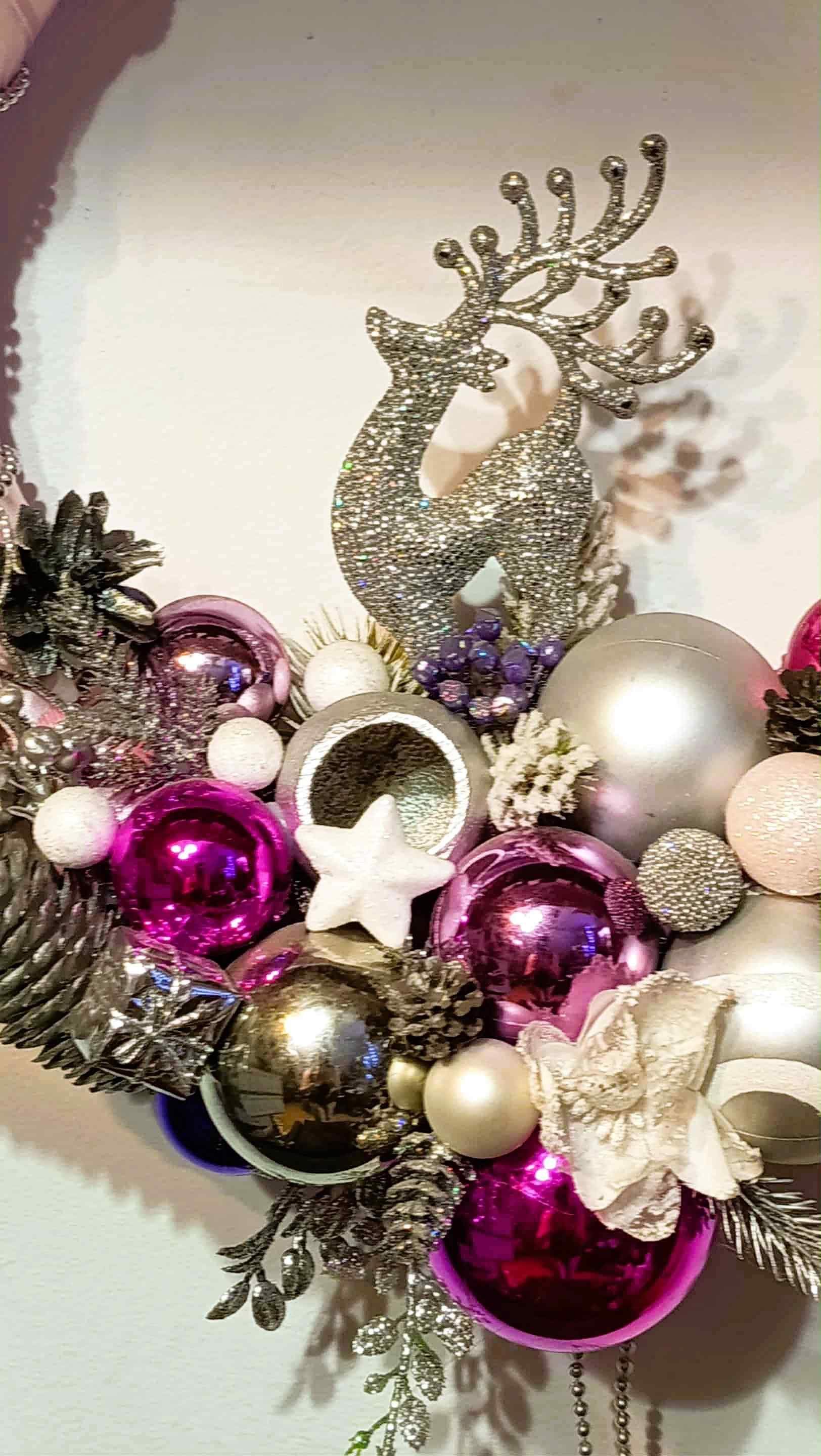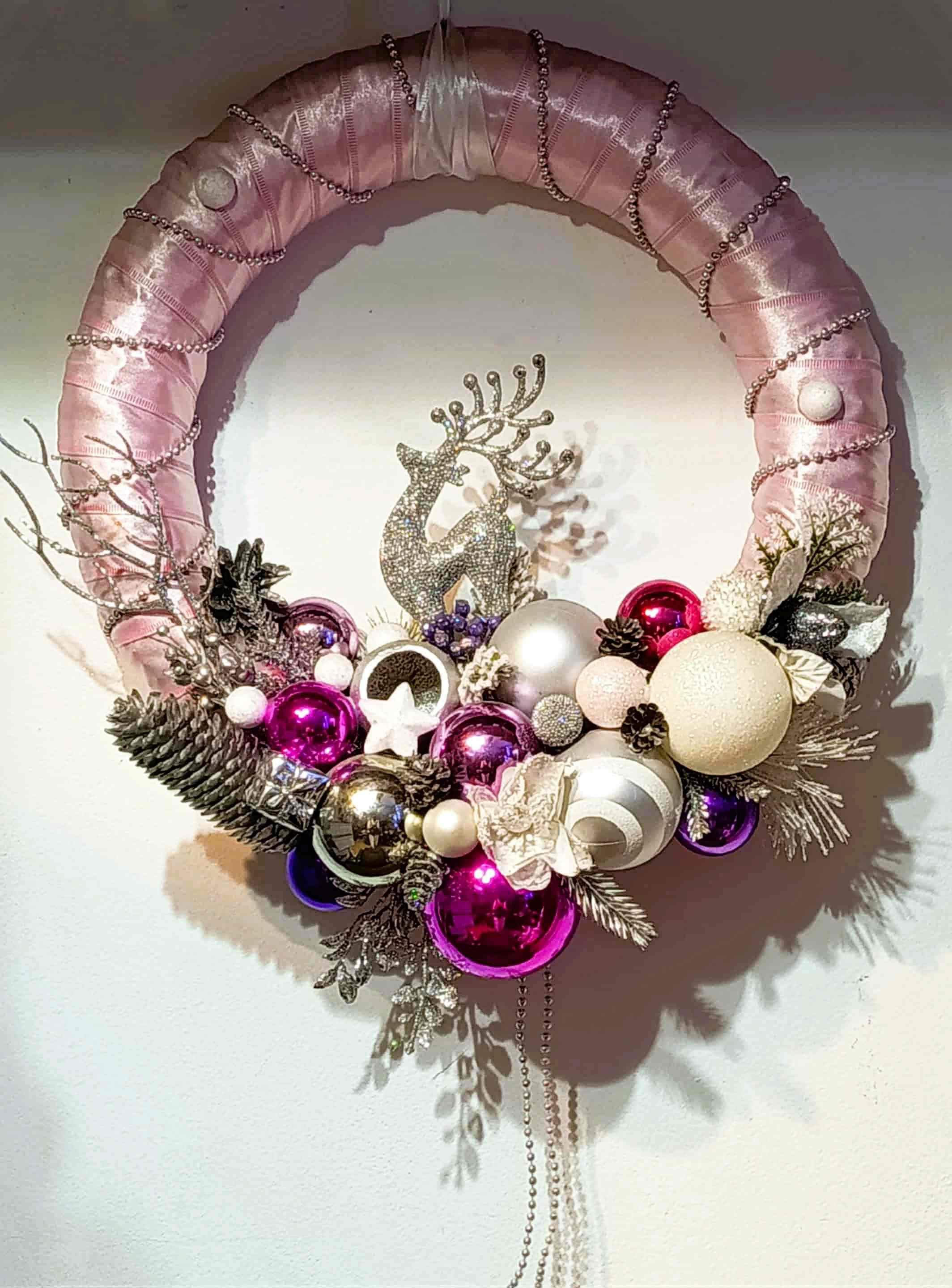 Wianek bożonarodzeniowy o średnicy 35cm, wykonany na bazie wianka słomianego, owinięty różową, atłasową wstążką z dekoracją z bombek, szyszek oraz renifera utrzymany w kolorystyce biało-srebrno-różowej.
