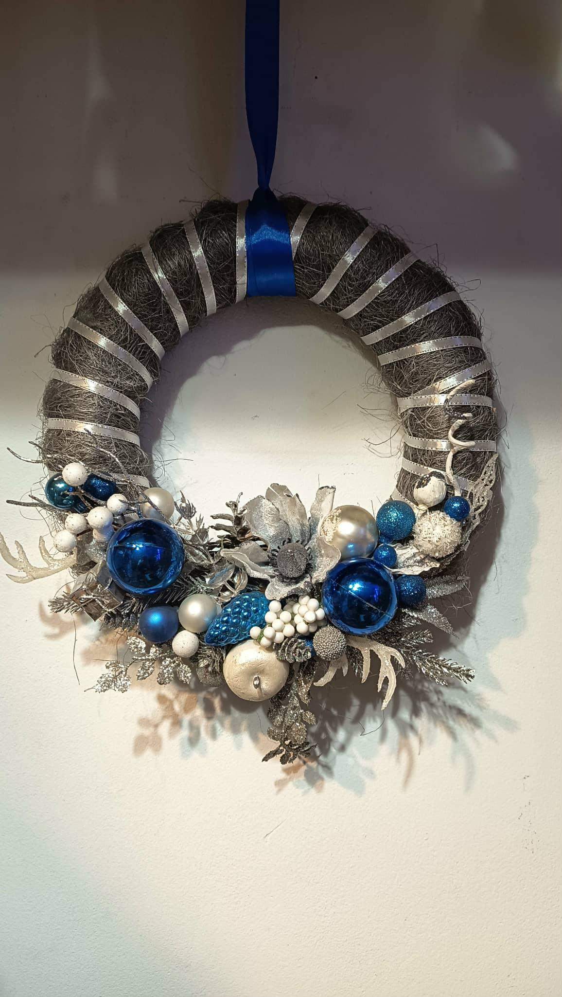 Wianek bożonarodzeniowy o średnicy 35cm, wykonany na bazie wianka słomianego, owinięty szaro-srebrnym sizalem i srebrną wstążką z dekoracją z bombek oraz szyszek utrzymany w kolorystyce srebrno-biało-niebieskiej.