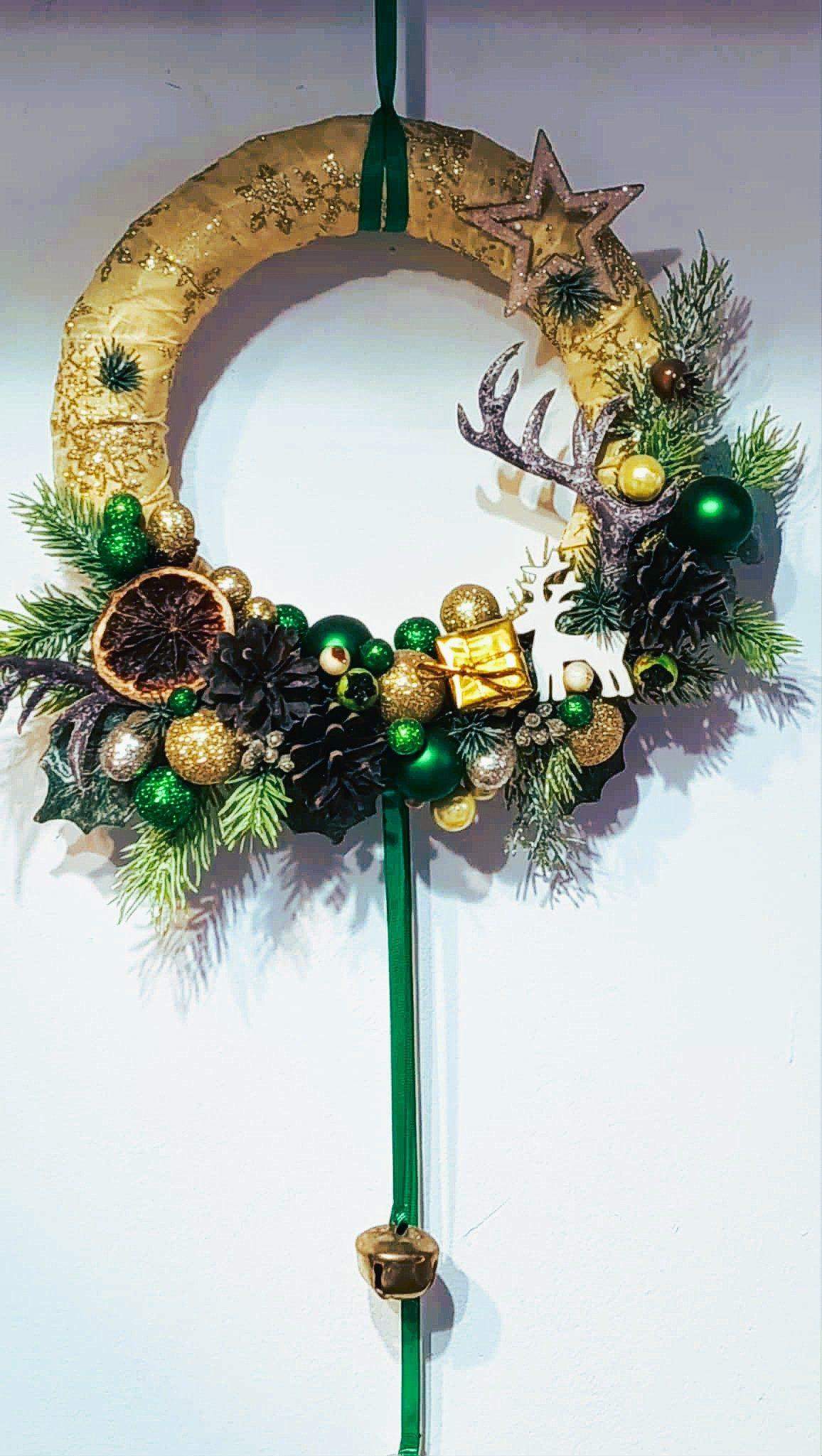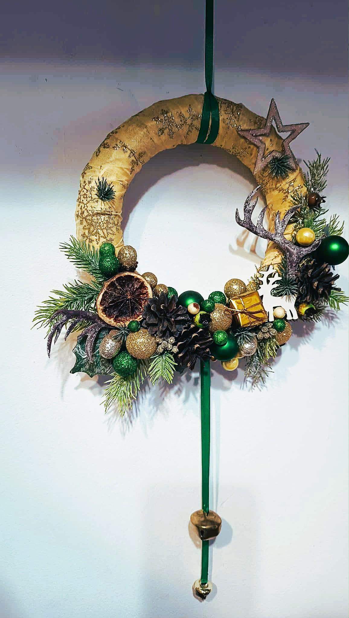 Wianek bożonarodzeniowy o średnicy 20cm, wykonany na bazie wianka słomianego, owiniętego w żółto-złoty materiał z dekoracją z małych bombek, szyszek i innych dodatków utrzymany w kolorystyce złota, zieleni, brązu i brokatu.