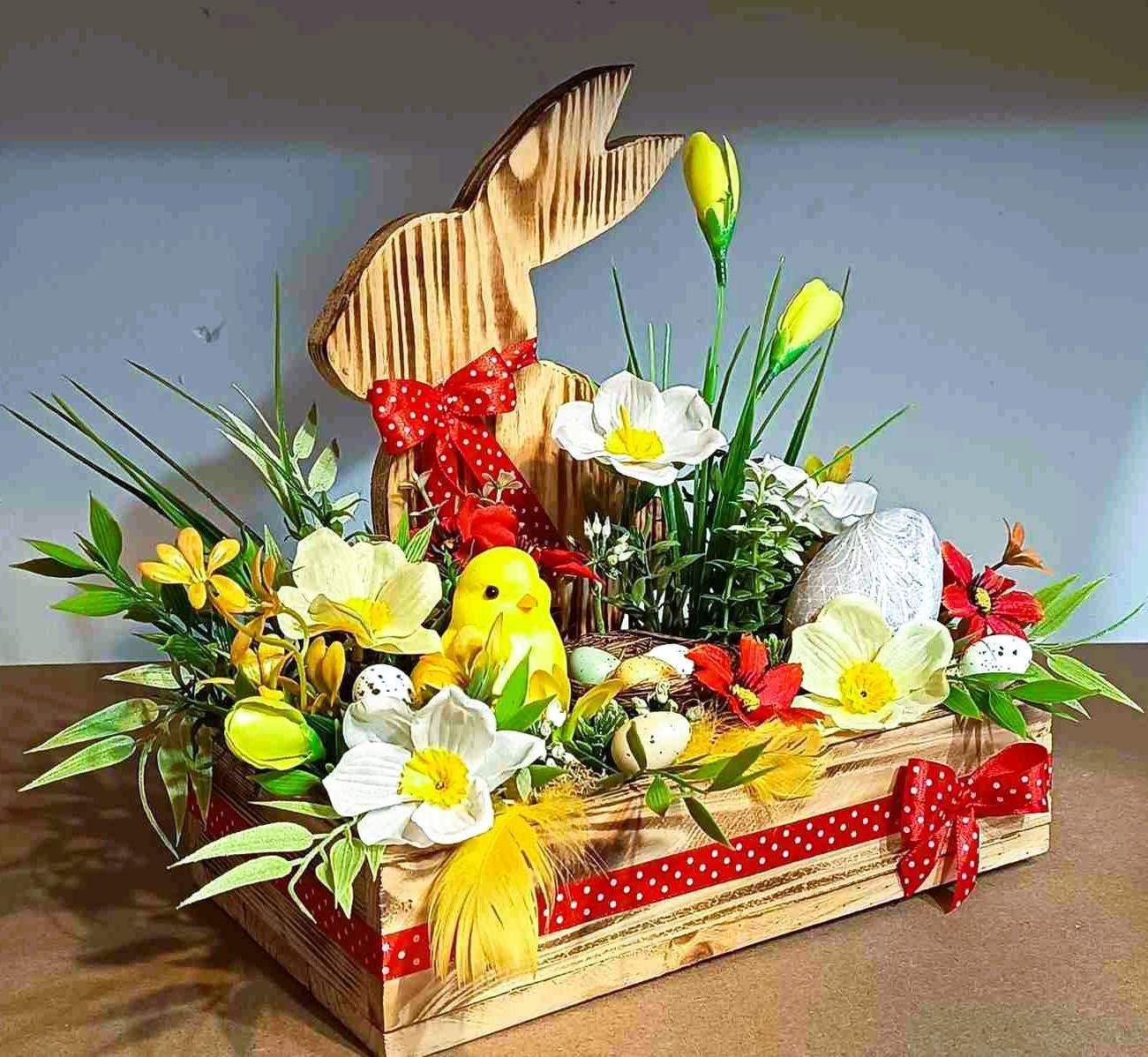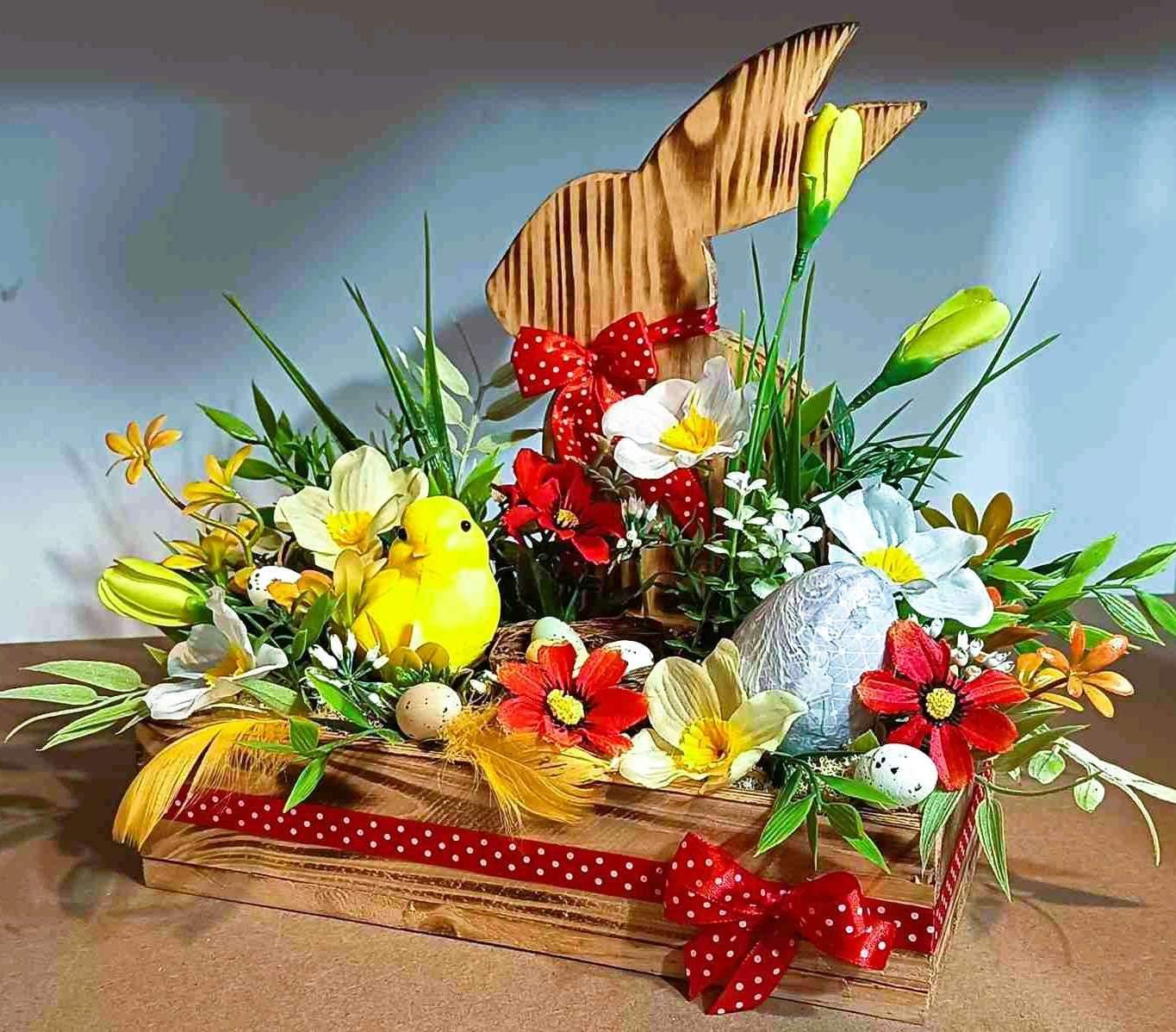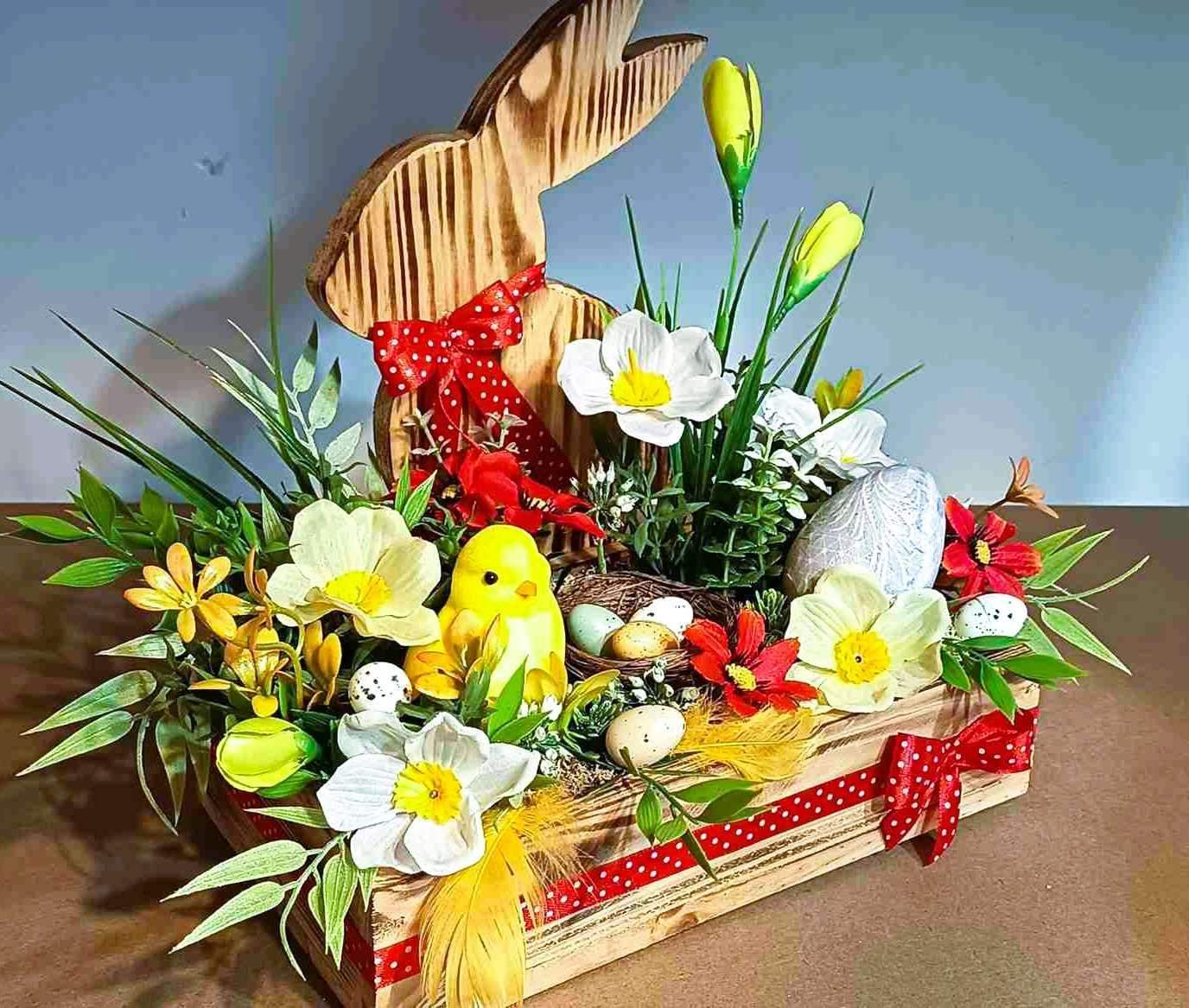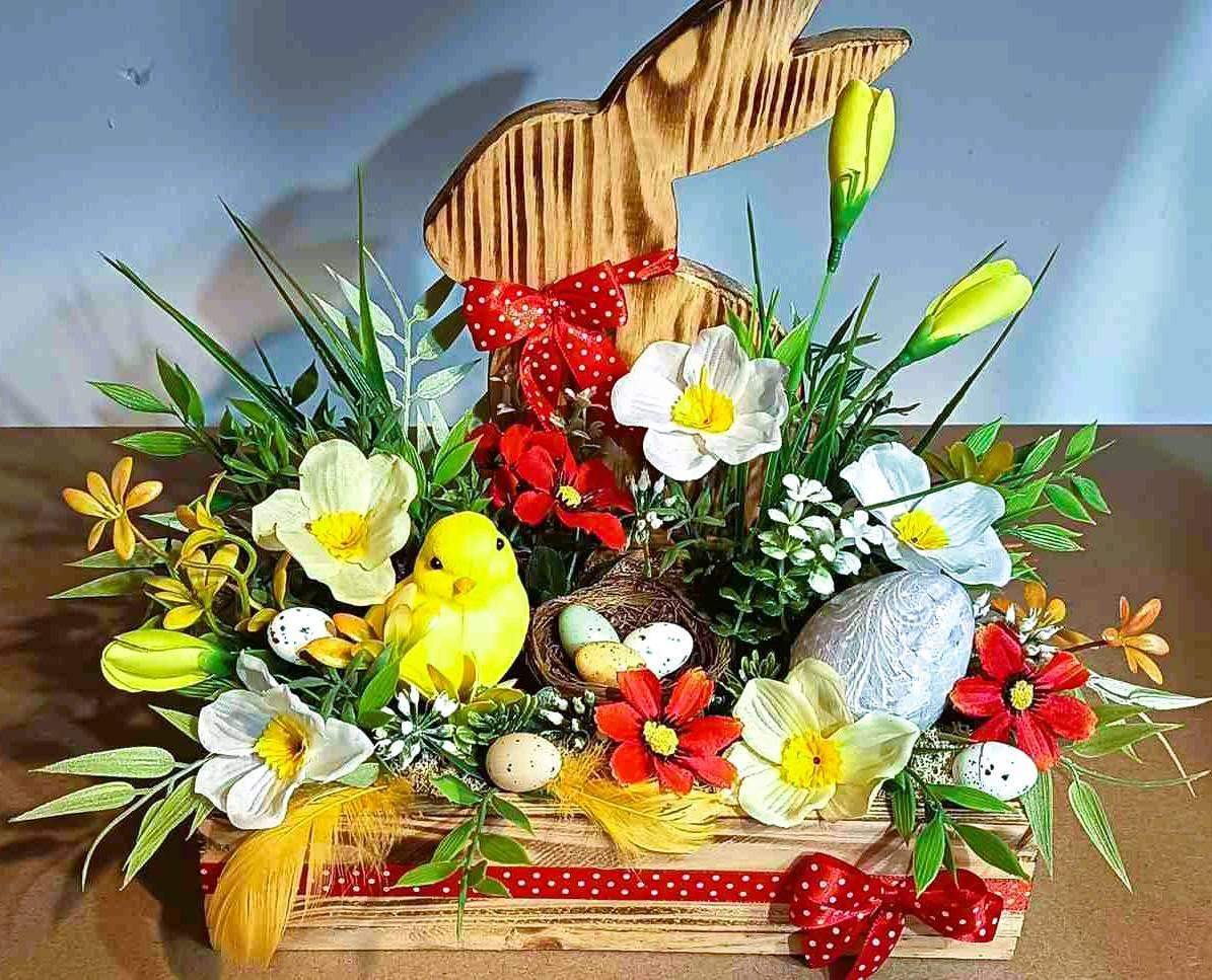 Centralnym elementem jest duży drewniany zając z czerwoną kokardą, otoczony kolorowymi kwiatami, z pisanką i kurczaczkiem, jajeczkami w gniazdku oraz delikatnymi dodatkami.