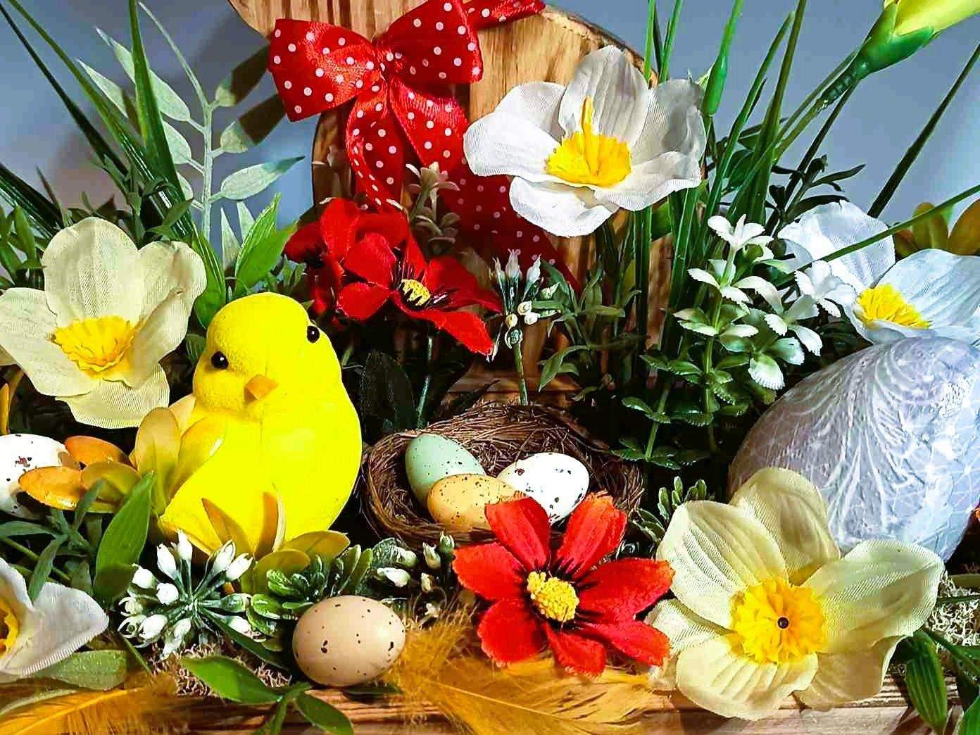 Dekoracja wielkanocna - kompozycja wykonana w drewnianej skrzynce z bogactwem detali i kolorów.